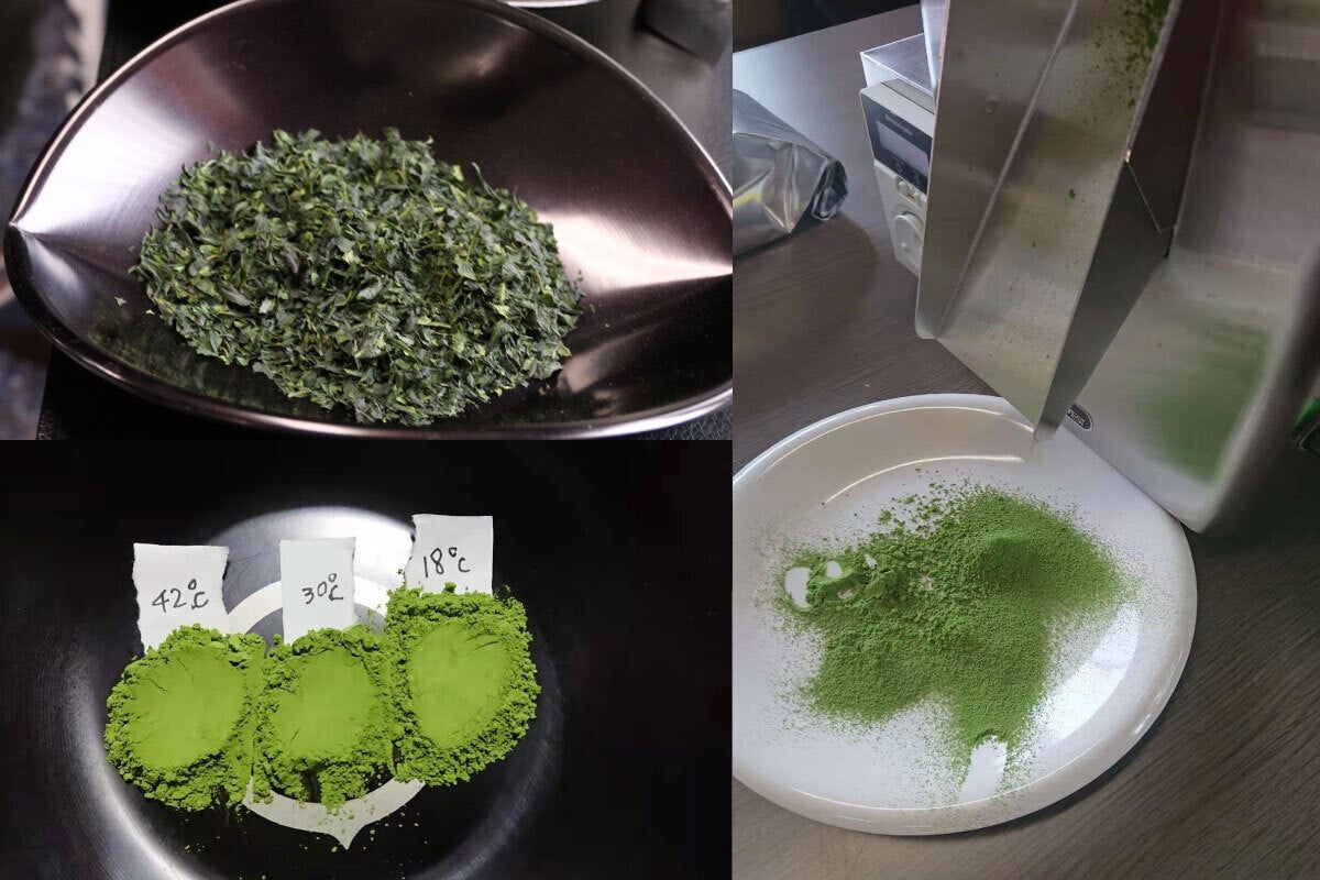 写真左上 碾茶粗茶/抹茶の原料茶です。写真左下 粉砕温度帯による色の変化実験 写真右ミクロパウダーによる、テスト粉砕
