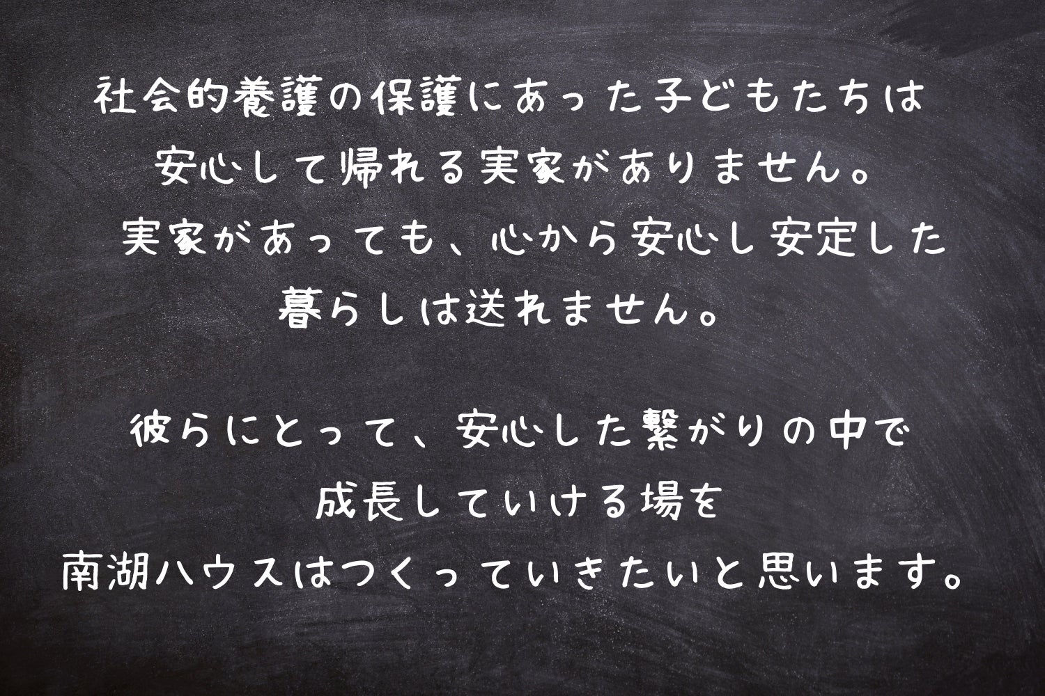今ある社会的養護の課題の根っこにアプローチするため南湖ハウスは活動していきます。