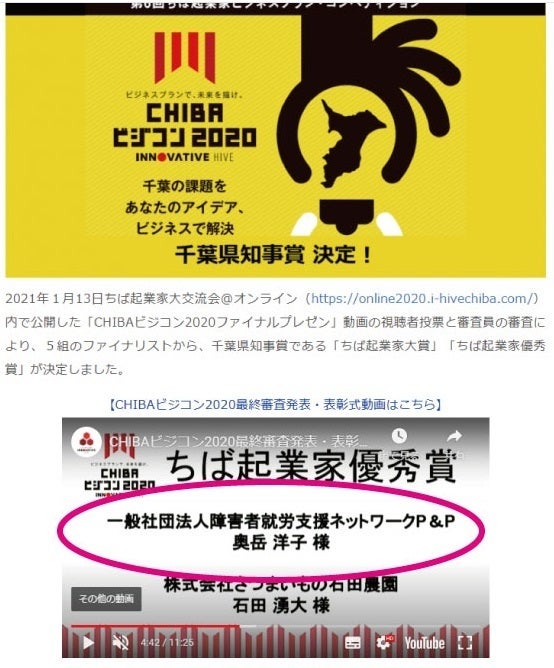 福祉事業所の強みをいかして、直接企業に企画を提案して直接取引を行い、福祉事業所に従来より多くの作業代を還元するという【障害福祉の商社になる!障がい者の収入をUPさせる事業】は、2021年1月に開催された「ちば起業家ビジネスプラン・コンペティション」で県知事賞ほか2社のサポーター賞(スポンサー特別賞)を受賞することができました。