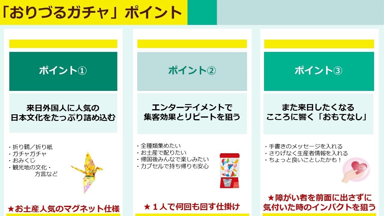 販路開拓の難易度が大幅に下がり職員の業務負担・精神的負担も軽くすることができます。そこまでが「おりづるガチャプロジェクト」の計画です。そのためには検証から慎重にスタートする必要があります。