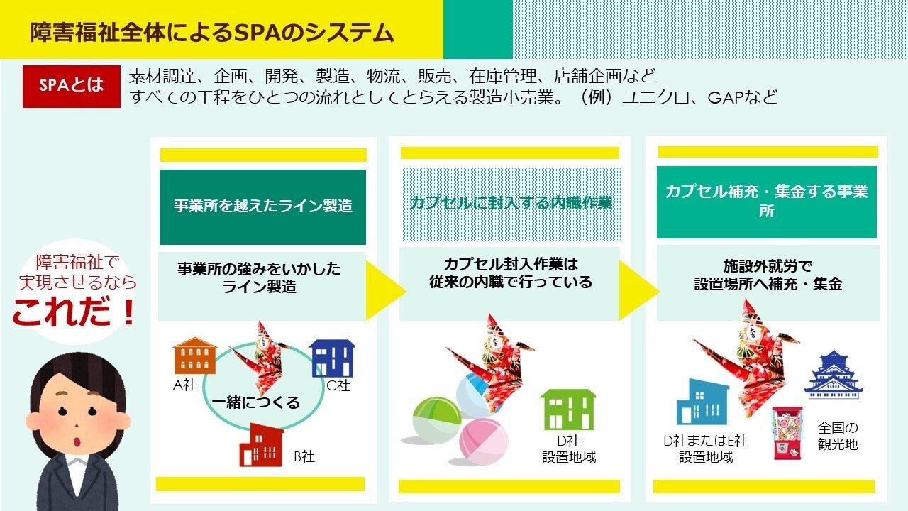 この商品を障害福祉全体によるSPA(製造小売業)で内職作業単価を従来の10倍以上に増やし、多くの事業所の販路開拓の負担軽減に挑みます!
