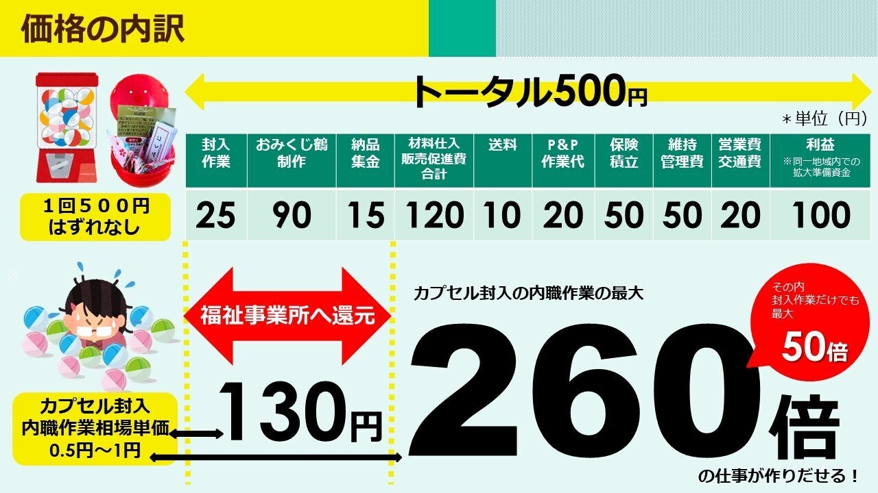 障害福祉=ガチャガチャというイメージが広く一般的になれば、各事業所が製作している自社製品を同様の手法(ガチャガチャ)で販売することが可能になります。