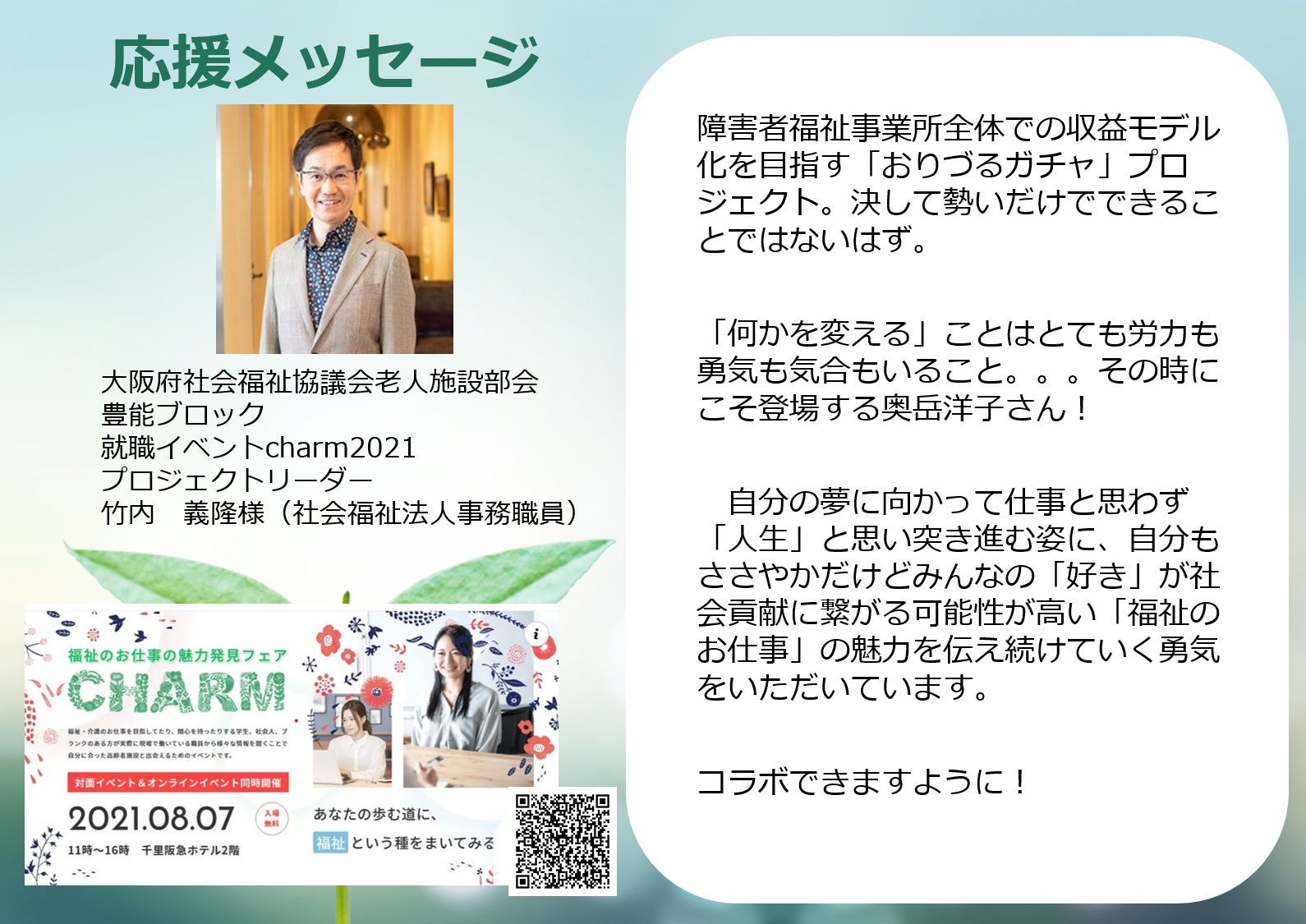 7月27日をもちまして、「おりづるガチャプロジェクト」のクラウドファンディングを終了いたしました。みなさんのあたたかい応援・ご支援のおかげで、ネクストゴールの目標金額を達成することもできました。本当に、本当にありがとうございます。 みなさまからのご支援をいただく期間は終了しましたが、プロジェクトとしてはここがあくまでスタートラインであり、今後も気を引き締めて取り組んでいきます。皆さまからいただいたあたたかい応援・ご支援もカプセルにたっぷり詰め込みます!「障害福祉の新しい未来」はもちろんのこと、「あたたかい日本」も世界に発信していけるアイテムを障害福祉のマンパワーで作ります。私たちもポストコロナの日本に貢献できるよう精一杯精進して参ります。◇◆リターンについて◆◇支援の際に選択いただいたリターンについて、準備の方を進めてまいります。詳細につきましては主にメールにてご連絡させていただきます。リターンの到着まで楽しみにお待ちいただけると嬉しいです(*^▽^*) ◇◆これからについて◆◇プロジェクトに関する進捗や近況は今後もFacebookを中心に更新していきます。「おりづるガチャプロジェクト」だけではなく、「おりづるの輪プロジェクト」や「ありがとうおりづる」についての投稿を行っております。本文末尾のリンクからご覧いただけると嬉しいです。重ねてにはなりますが、この度は「おりづるガチャプロジェクト」を応援・ご支援いただき誠にありがとうございました。今後も何卒よろしくお願いいたします。*━*━*━*━*━*━*━━*━━*━━*━━<最新情報はFBで随時発信中です!>●Facebook :奥岳洋子個人アカウントhttps://www.facebook.com/yoko.okutake.58/*━*━*━*━*━*━*━━*━━*━━*━━