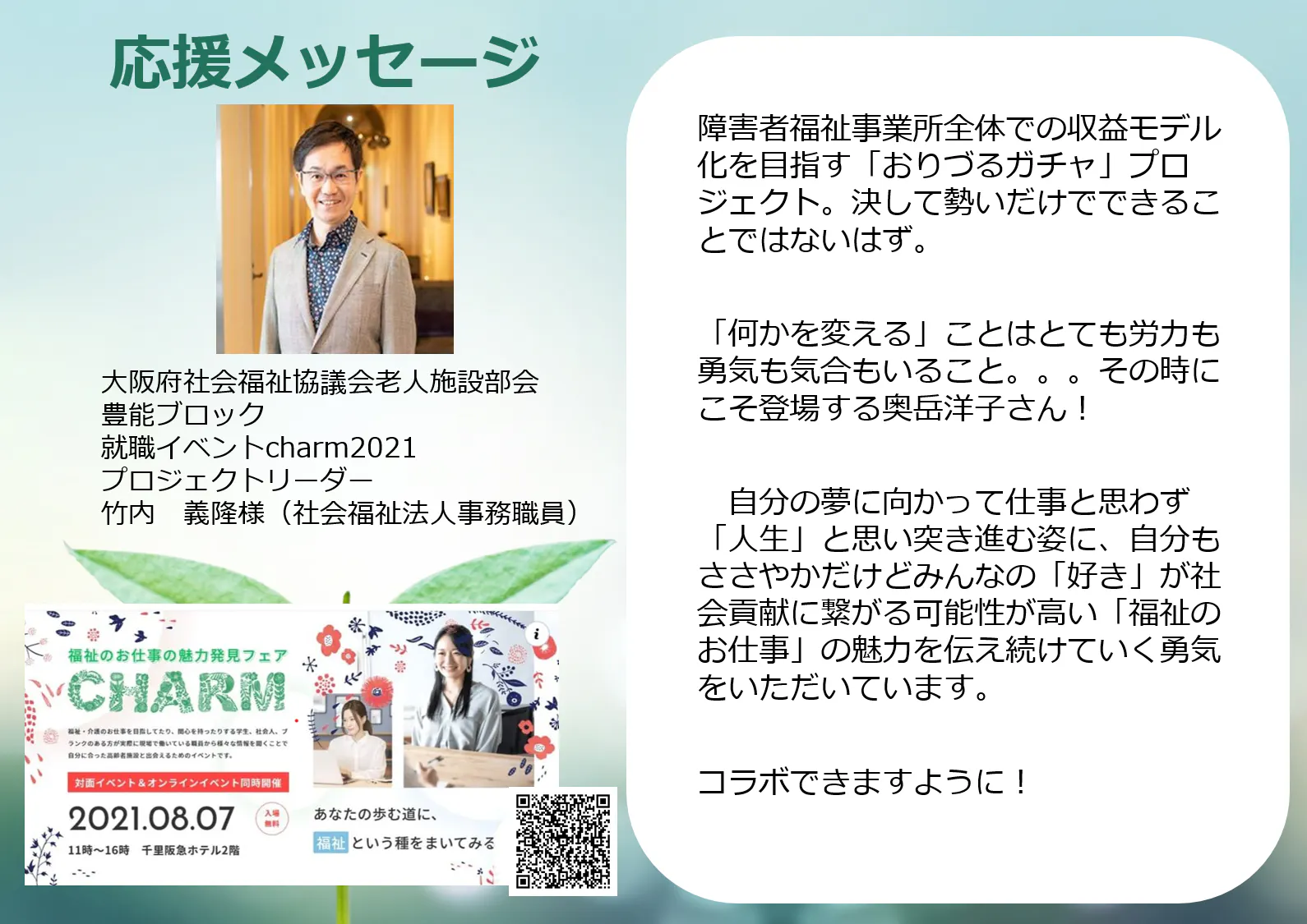 Facebookで知り合い、その後、福祉つながりで交流をさせていただいている【福祉のお仕事魅力発見フェアCHARM】のプロジェクトリーダーである竹内義隆様より、応援メッセージをいただきました(*^-^*)