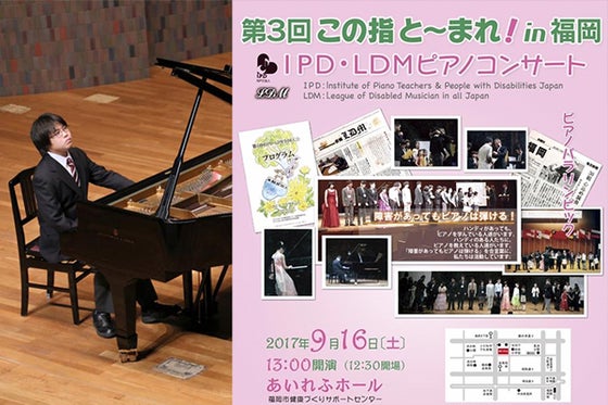 2017年9月16日(土)、福岡・博多にある福岡市健康づくりサポートセンター あいふれホールにて、「第3回この指と~まれ!in福岡 IPD・LDMピアノコンサート」に出演することが決定しました!