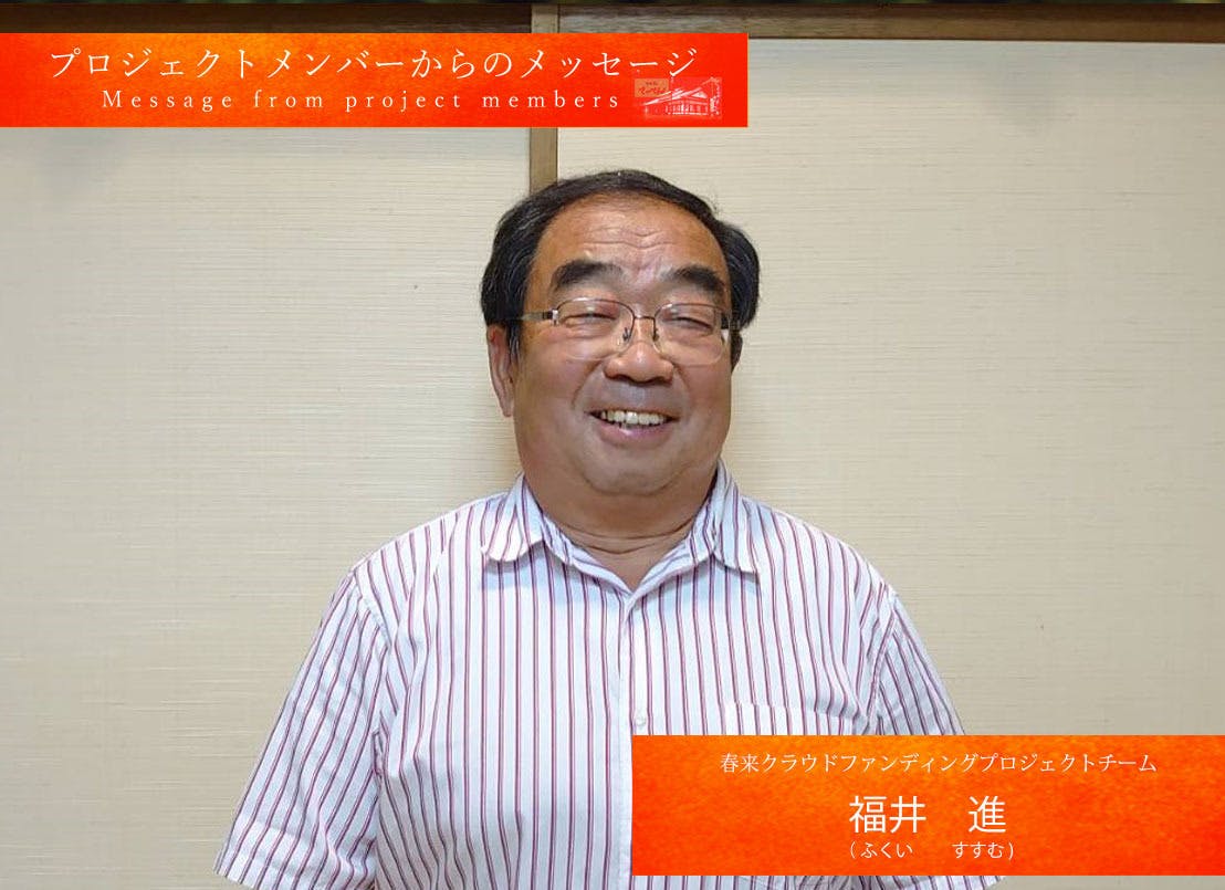 春来クラウドファンディングプロジェクトチームの福井進です。私は、この地で生まれて高校卒業まで暮らし、その後大阪で生活。