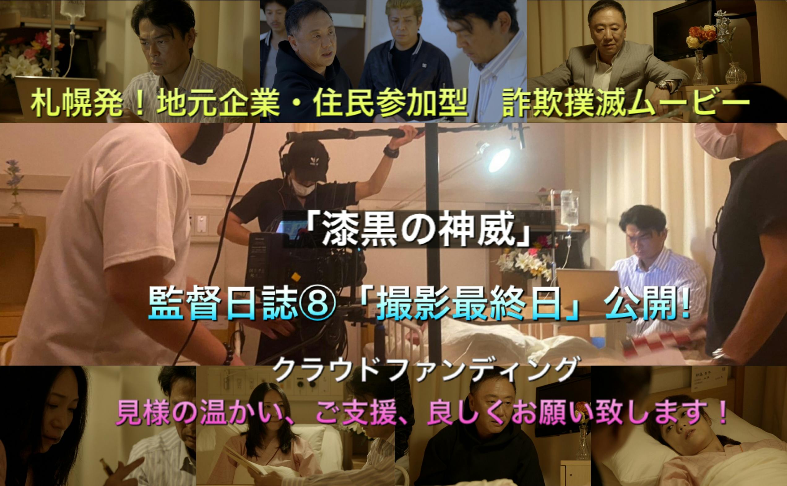 2021/07/25 07:00監督日誌⑧本日クランクアップ最終日です。はじまる前は脚本の執筆から準備等やることが山ほどありはやく始まらないかと思いますが、はじまってしまうとあっと言う間に終わってしまいます。さて本日は明大前のスタジオをお借りしました。まずはエリカの病室です。ネタバレしてしまうので詳細は書けませんが病室にいるエリカ(浅森夕紀子)を北條(川本淳市)が訪ねるシーンです。いつものことながら撮影に没頭していると川本さんから意外な言葉をかけて頂きました。「監督は人情味のあるヒューマンドラマが好きなんですね」そうです、ヴァイオレンスなアクションももちろん好きですが、感情の深いところの心と心のふれあいが垣間見れると心琴線に触れてきます。しかし一体、私は川本さんにどうおもわれていたのでしょうか?川本さんと浅森さんは同じ47ENGINEのメンバーですが、以外にも二人がここまで濃厚なお芝居をするのは初めてだそうです。その微妙な緊張感がとても良い雰囲気だったと思います。 つづいては杏子の病室です。そうなんです、ここまで読んで頂いた察しの良い方ならお気づきでしょうが、杏子(藤岡範子)とエリカがある事件に巻き込まれてしまいかつ怪我を負って入院してしまうのです。おっとこれ以上はご容赦ください。つづきは本編をお楽しみに。入院している杏子のところには、匠(川原英之)、欣二(川瀬忠行)、村岡(ジョニー門倉)が駆けつけます。怒りに震える匠、たじろぐ、欣二、村岡、緊迫感のあるシーンの連続でした。今日はいつもよりは少し時間にゆとりがあり、じっくりと撮影する事ができ、濃厚なシーンが撮れました。 これにて撮影終了です。数多くの方々の協力、お手伝いによってすべての撮影を終える事が出来ました。皆さま本当のご苦労様でした、ありがとうございました。これから仕上げに入ります。最後まで読んで頂きありがとうございました。この作品を一人でも多くの方々に観て頂きたいと思います、ぜひご支援宜しくお願い致します 蓮野稜悠札幌発!地元企業・住民参加方 詐欺撲滅ムービー「漆黒の神威」長編制作プロジェクト!皆様の温かいご支援、宜しくお願い致します。https://camp-fire.jp/projects/view/432448 もっと見る
