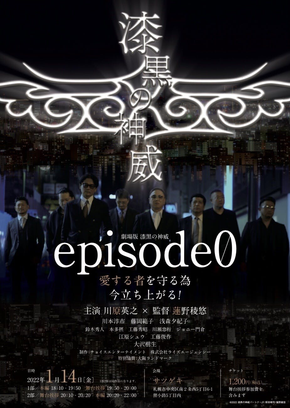 2022/01/11 14:15昨年、沢山の皆様にご支援、ご協力頂き、撮影を行った「漆黒の神威~episode0~」が完成!作品の舞台となった札幌にて劇場公開が決定しました!改めまして、撮影にご協力いただいた札幌の皆様、出演者、スタッフの皆様、そして、クラウドファンデイングへの温かいご支援、ご協力を頂いた皆様、本当にありがとうございました。今回の札幌での上映を皮切りに、今後、横浜での上映なども予定しており、これから本作を沢山の皆様にお届けしていきたいと思っております。(横浜での上映については、詳細が決まり次第、お知らせさせて頂きます)下記、札幌での上映の詳細と、予告編となりますので、是非ご覧ください。今後とも「漆黒の神威~episode0~」 をどうぞよろしくお願い致します。札幌発!地元企業・住民参加型詐欺撲滅推進映画「漆黒の神威〜episode 0〜」劇場公開決定!監督 蓮野稜悠主演 川原英之 出演 川本淳市 工藤俊作 江原シュウ 大沢樹生 他2022年1月14日(金)2回上映1回目本編上映18時10分〜19時50分舞台挨拶19時50分〜20時00分2回目舞台挨拶20時10分〜20時20分本編上映20時20分〜22時00分舞台挨拶の登壇者などは後日「漆黒の神威」HPやSNSなどにてお知らせします。上映会場「サツゲキ」https://www.sugai-dinos.jp/cinema/sapporo/札幌市中央区南2条西5丁目6-1狸小路5丁目内チケット料金1200円(税込)制作 チョイスエンターテイメント 株式会社ライズエージェンシー特別協賛 株式会社大阪ランドマーク上映・チケットに関するお問い合わせはチョイスエンターテイメント TEL 0116993232担当 川上 まで。沢山の皆様のご来場、お待ちしております。 もっと見る