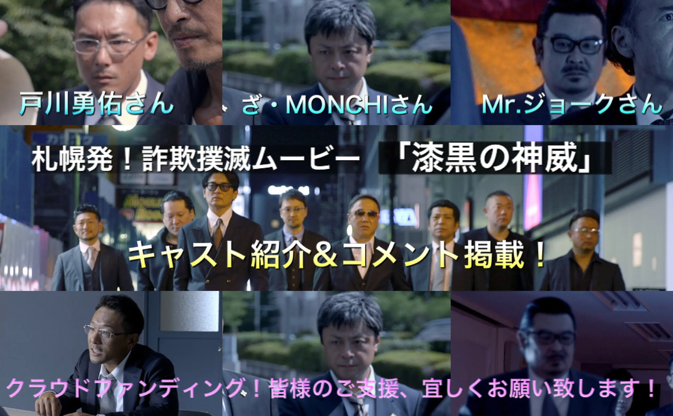 はじめまして!漆黒の神威エピソード0で刑事1役として出演しております戸川 勇佑です。今回のプロジェクトをご覧頂きありがとうございます。私自身、役者として全くの素人でして、映画は見るばかりで最初はほんのお手伝いのつもりでおりましたが、プロデューサー、監督のご厚意で大役を頂き、演技の面白さに気付いてしまった所でございます。なかなか無くならない詐欺被害を少しでも無くせないか、その明確なコンセプトをもとに監督や役者さん、製作スタッフさん一丸となって作り上げる現場の中に一員として居られることをとても誇りに思います。これからも皆さんの支援のもと、漆黒の神威シリーズが沢山の方に見て頂けることを願っておりますのでよろしくお願いいたします。