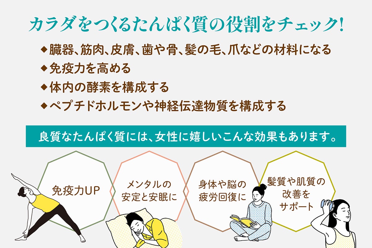 たんぱく質は、カラダを構成する骨や筋肉、皮膚、爪、髪の毛などをはじめ、生命を維持するために行われる様々な代謝に関わる酵素やホルモンの材料になるなど、生命活動のために必要な重要な栄養素なのです。