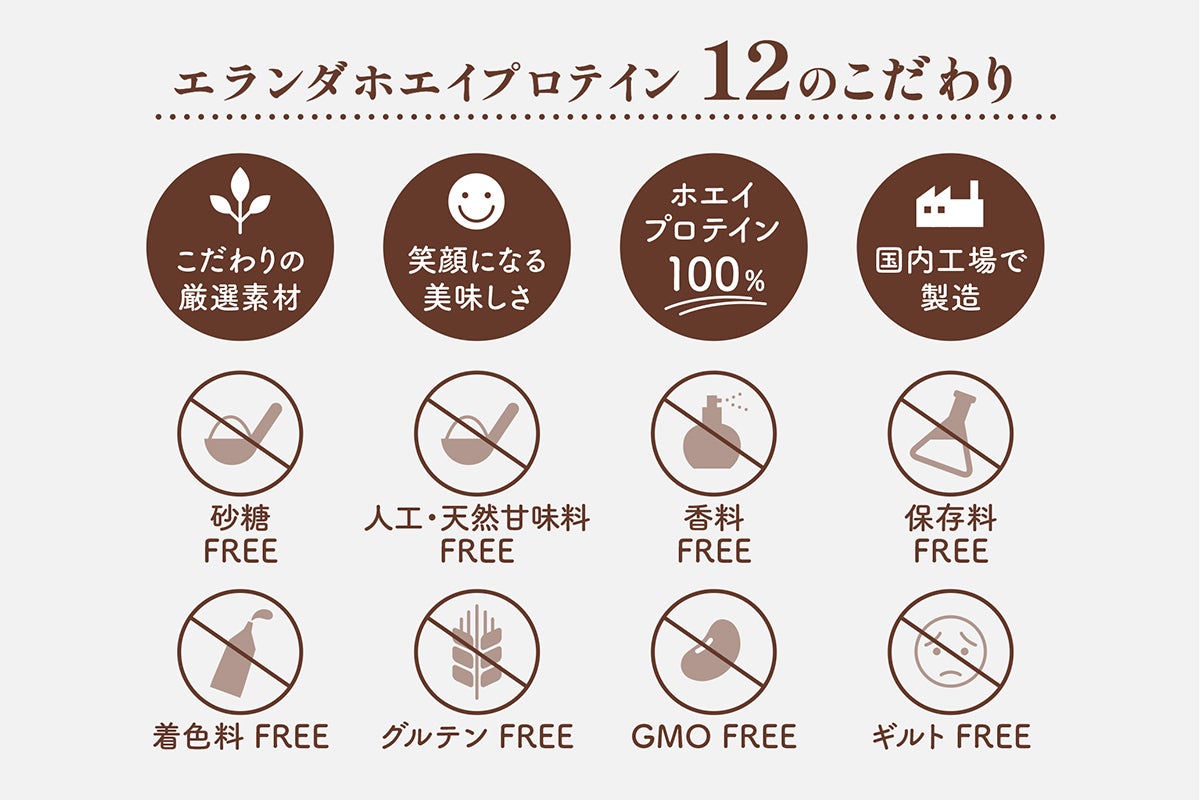 毎日の食事を大切にするように、カラダに取り入れるものはナチュラルで安全なものだけ。それがエランダホエイプロテインの信念です。プロテインには、人工甘味料や香料が入っていることが普通です。天然甘味料と言ってステビアを使うことがありますが、エランダホエイプロテインはこれも使っていません。なので、本当に甘くないのです。