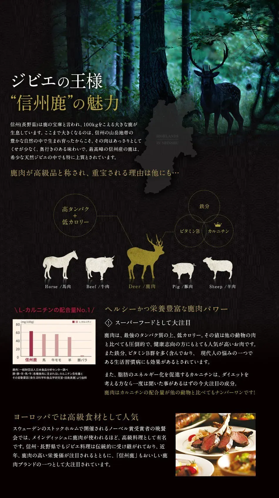 信州の山々を駆け巡った鹿の肉は、身が引き締まっており脂肪が少なく、健康や体型を気にする方にもおすすめ!(厳しい体調管理を求められるアスリートに適しているほか、ダイエット食や高齢者の介護食としても注目が集まっています)