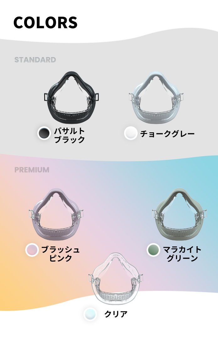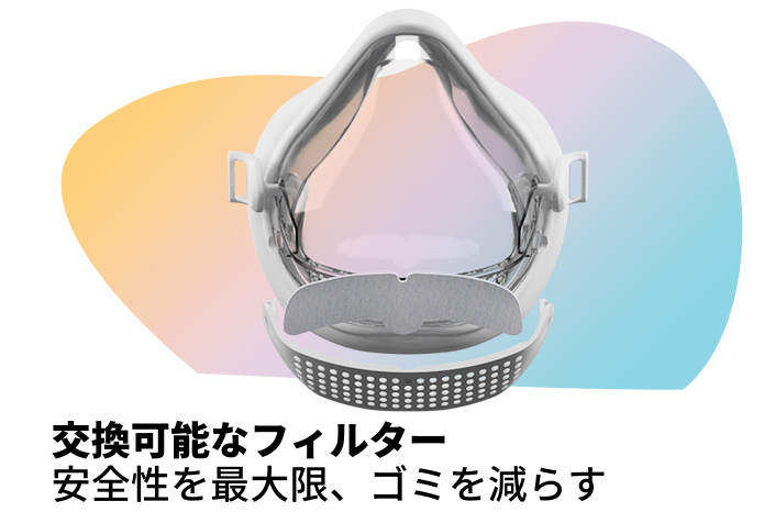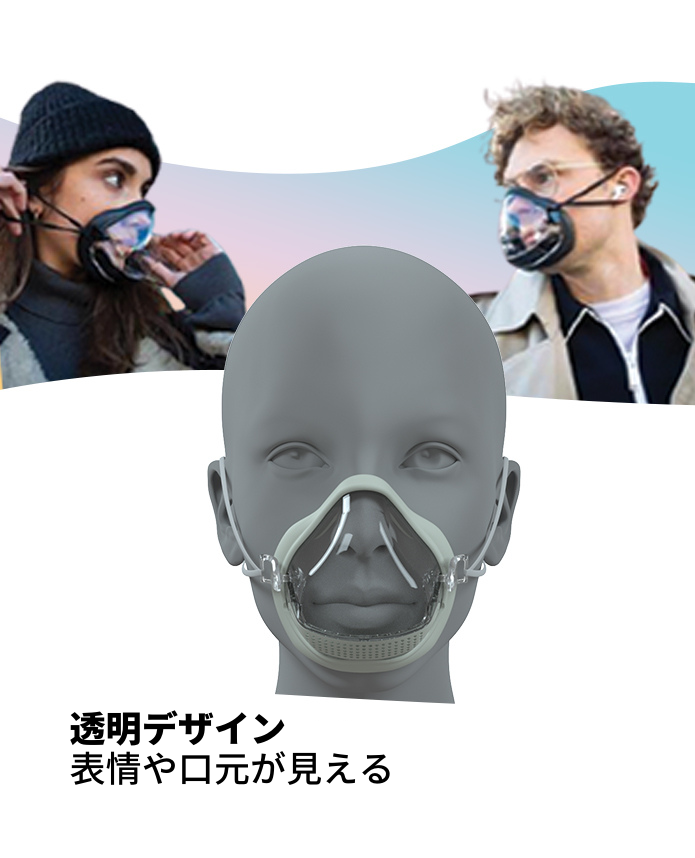 マスク自体は透明なボディに徹底しましたが、シリコンフレーム、クリップ、フィルターカートリッジにはオーガニックでシンプルな色を採用しました。