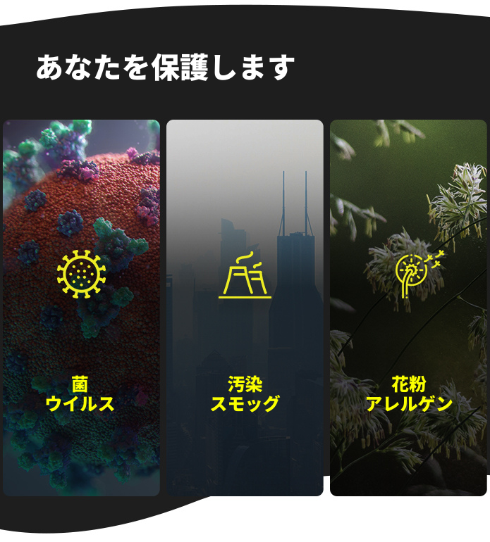 私達のAIOフィルターパッドは様々な空気汚染物質よりあなたを守ります。
