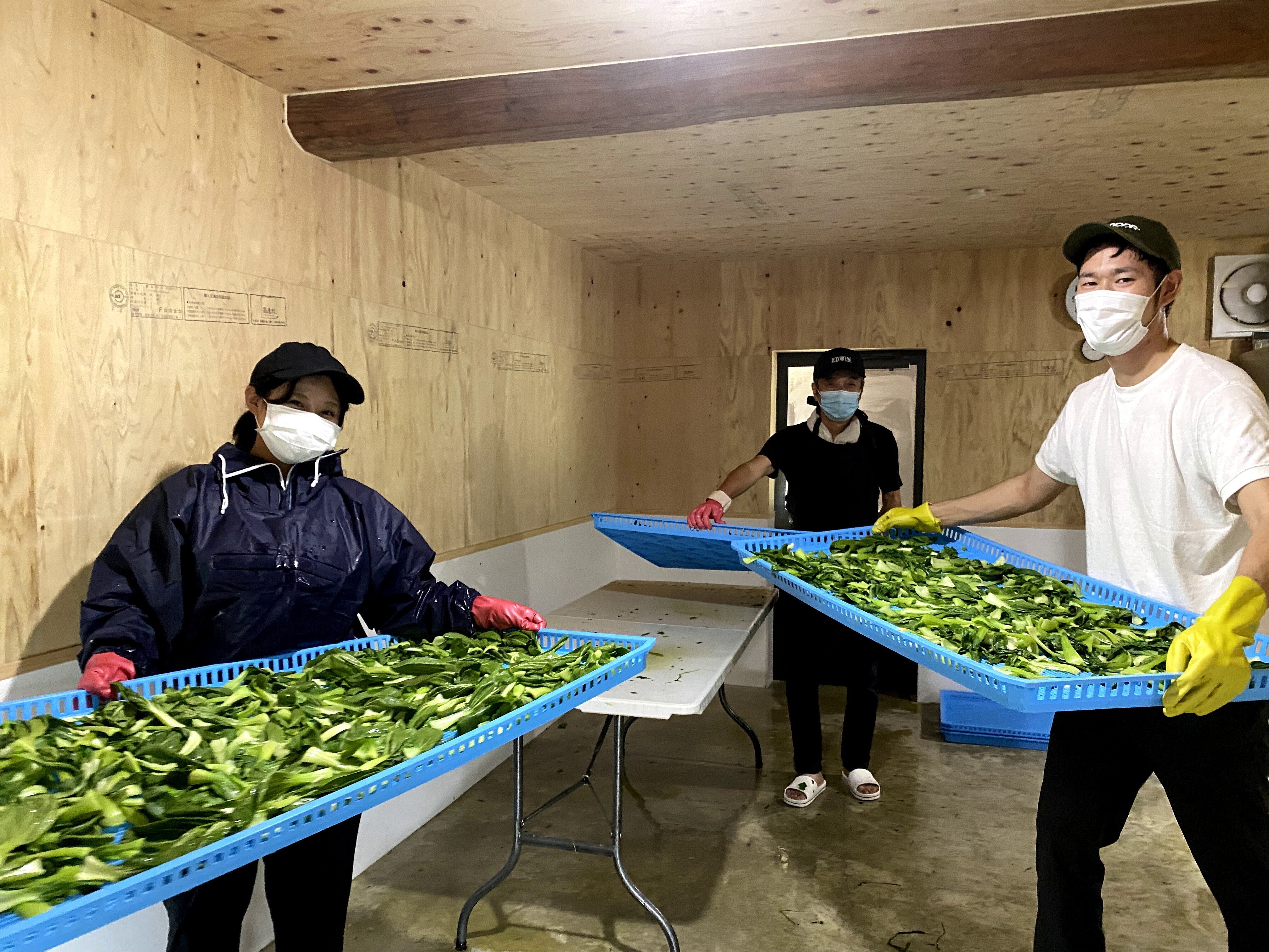 本プロジェクトでは、この豪雨により被害にあったチンゲンサイも買取りました。洗浄、ブランチング(下茹で)、高温乾燥することで、捨てられる野菜に再び長期間の命を吹き込んでいます。