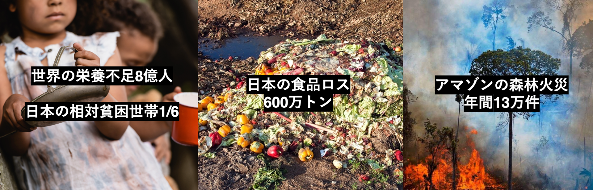 私たちが生きている世界では「大量の食べ物が廃棄」されている一方で、食糧難により「大量の人が栄養不足」に苦しみ、さらに食物を生産するために「大量の森林が伐採」されています。