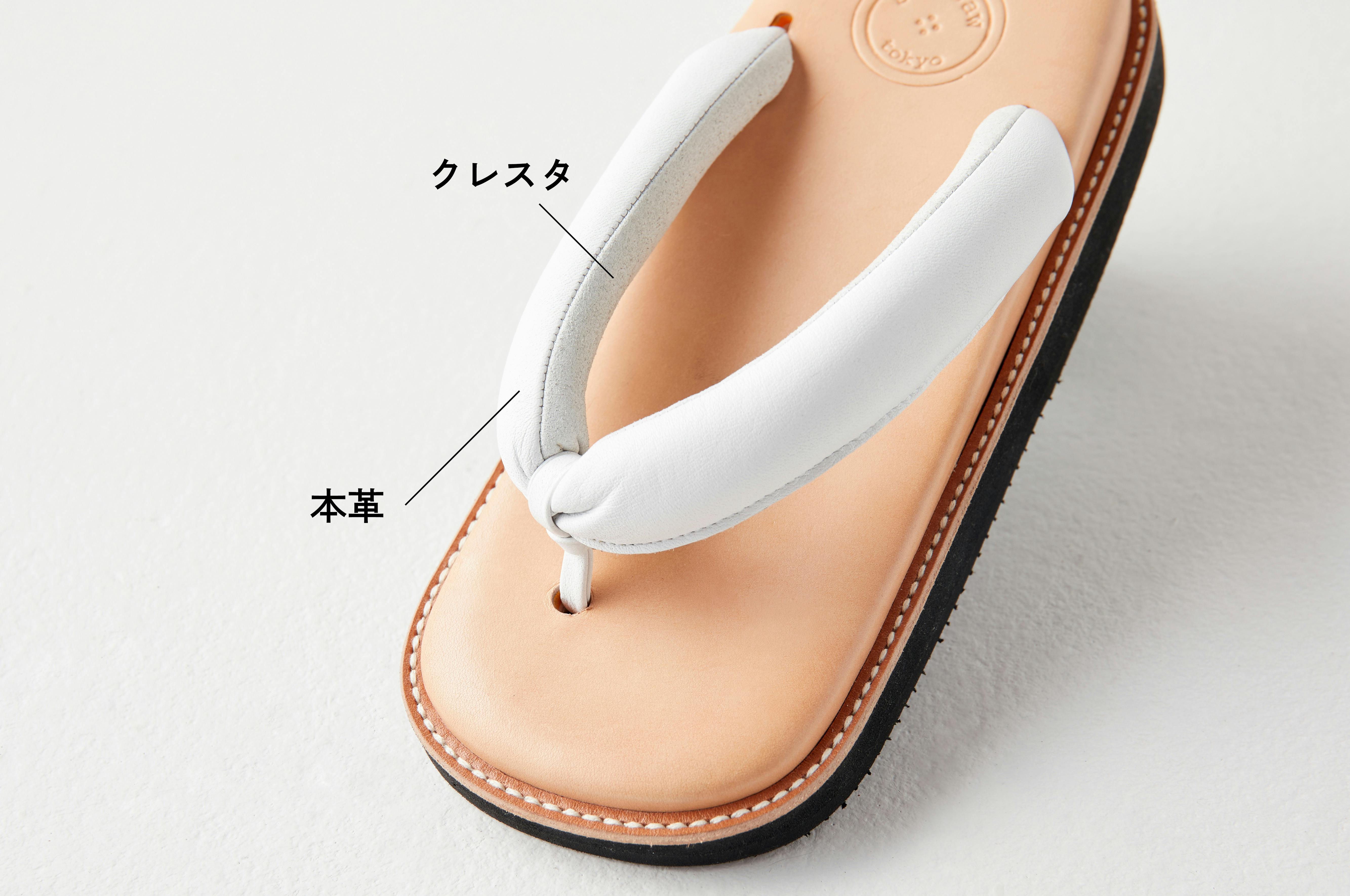 "ホワイト" 男女問わずに着用しやすいのがヌメ革の天板に、ホワイトレザーの鼻緒を組みわせたこちら。定番として長く愛用したいタイムレスな仕上がりです。