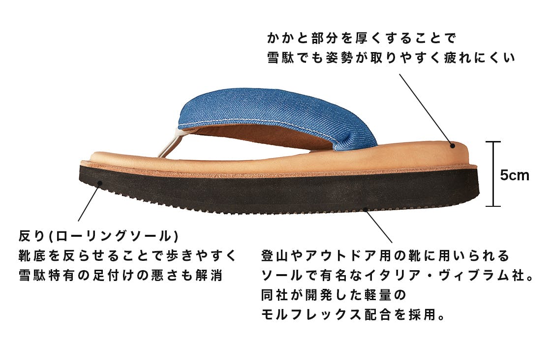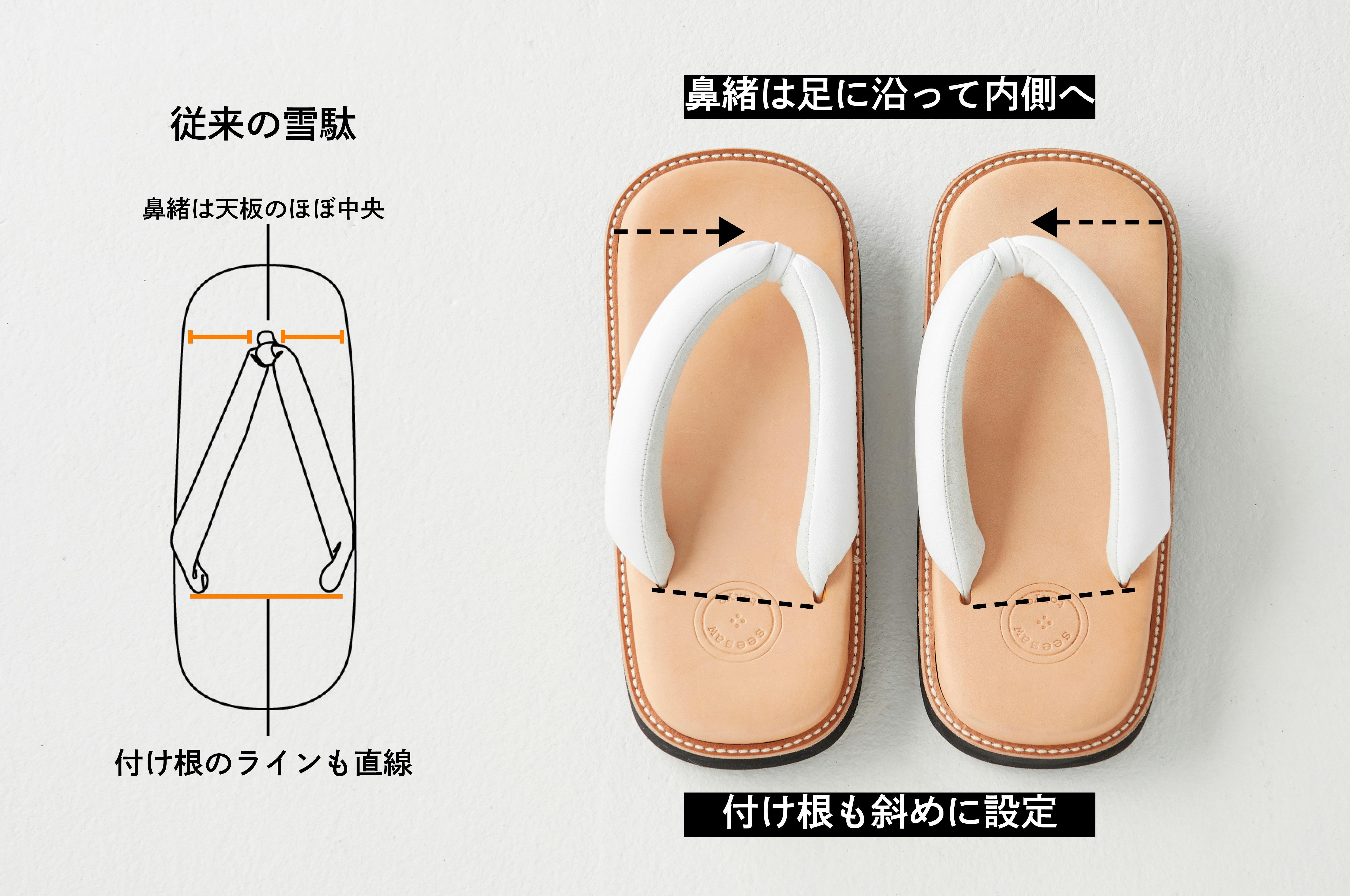 人の足の形に合わせ、サン駄では鼻緒の位置を足の親指の付け根に寄せレイアウト。これにより履いた際の足が楽になるとともに、歩いている際に踵が落ちることも防ぐなど、リラックスした歩行をアシストします。