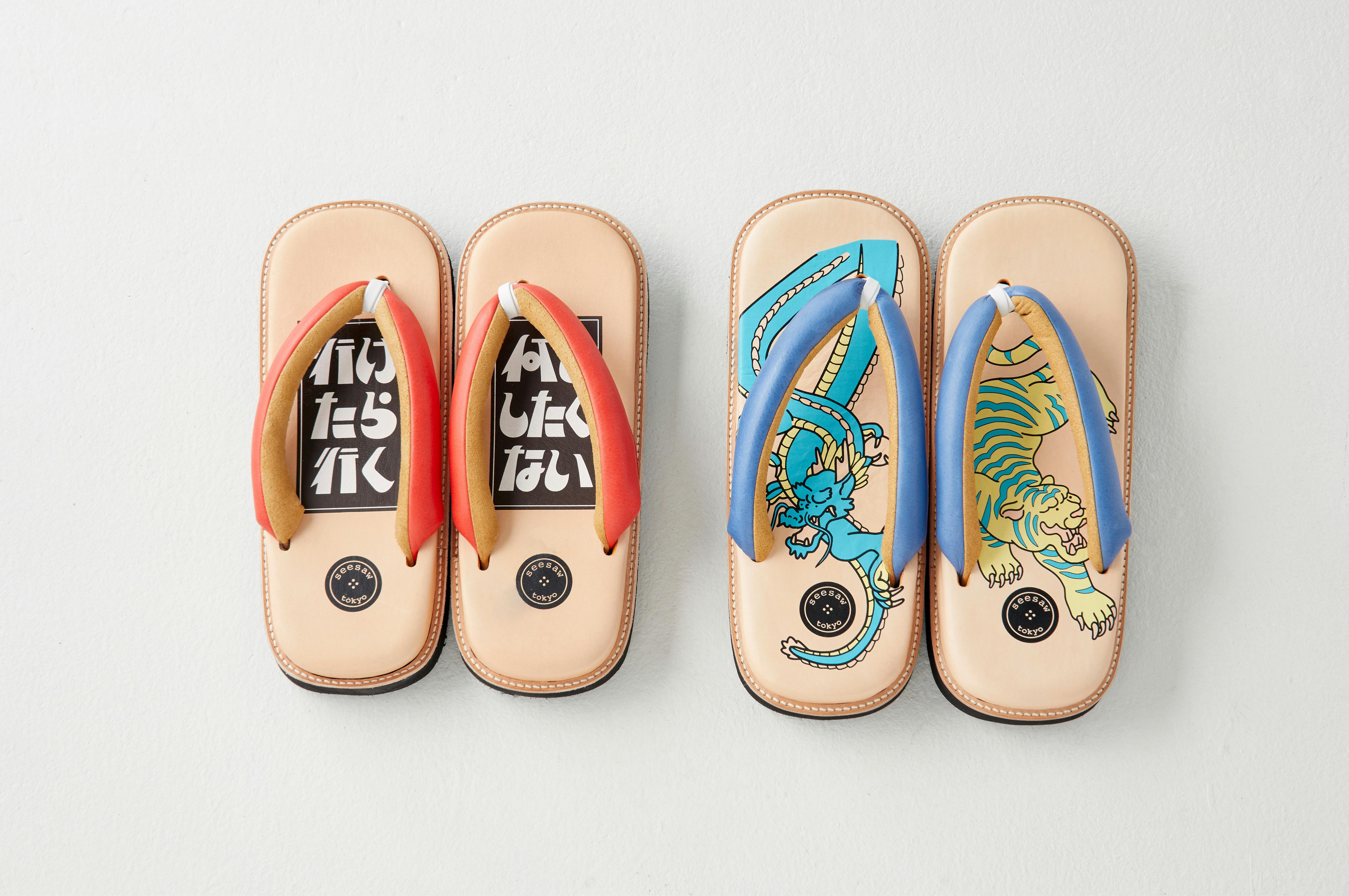 "龍虎" イラストレーターの辻野清和さんのイラストを乗せたサン駄。絵柄はポップさもありますが、レザーの重厚な風合いが掛け合わせられることで、風格に満ちた仕上がりになっています。
