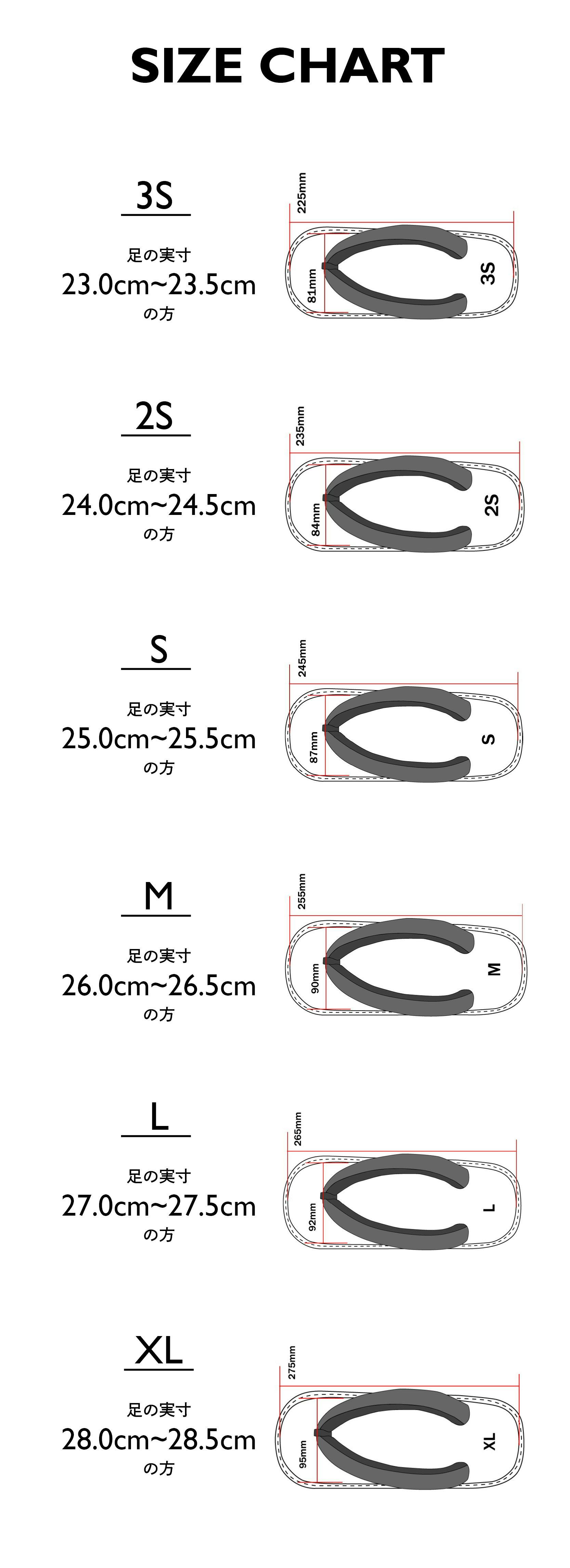 サン駄はメンズサイズ、レディースサイズの両方を展開いたしております。靴のサイズ選びについてはご自身の足の実寸を下記のサイズチャートと比較してお選びください。