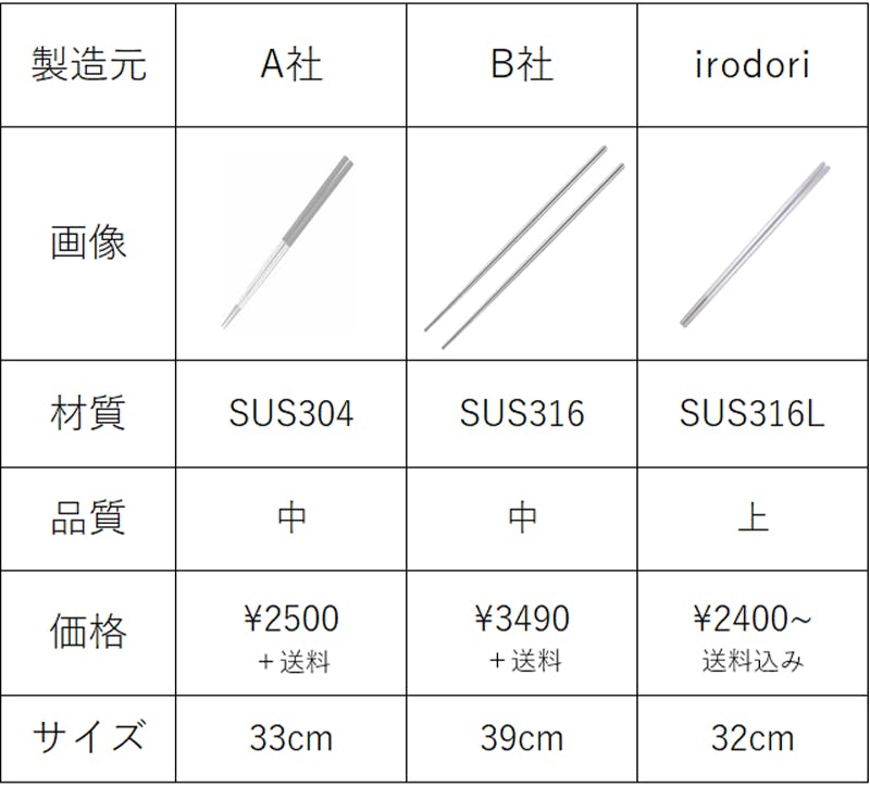 少しずつネットでも出回りはじめているステンレスの菜箸ですが、316Lステンレスはまだほとんどなく、お値段も高いものが多いです。今回クラウドファンディングさせていただくにあたり、手にとっていただきやすいよう価格でも皆様に貢献させていただきたいという想いでリターンを作らせていただきました。