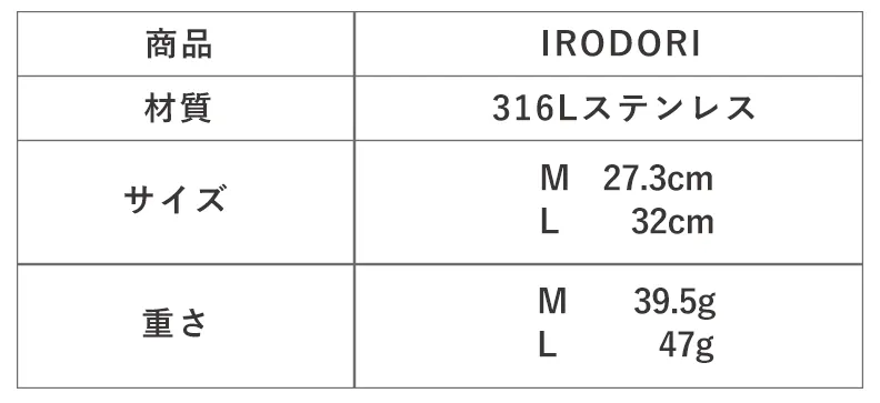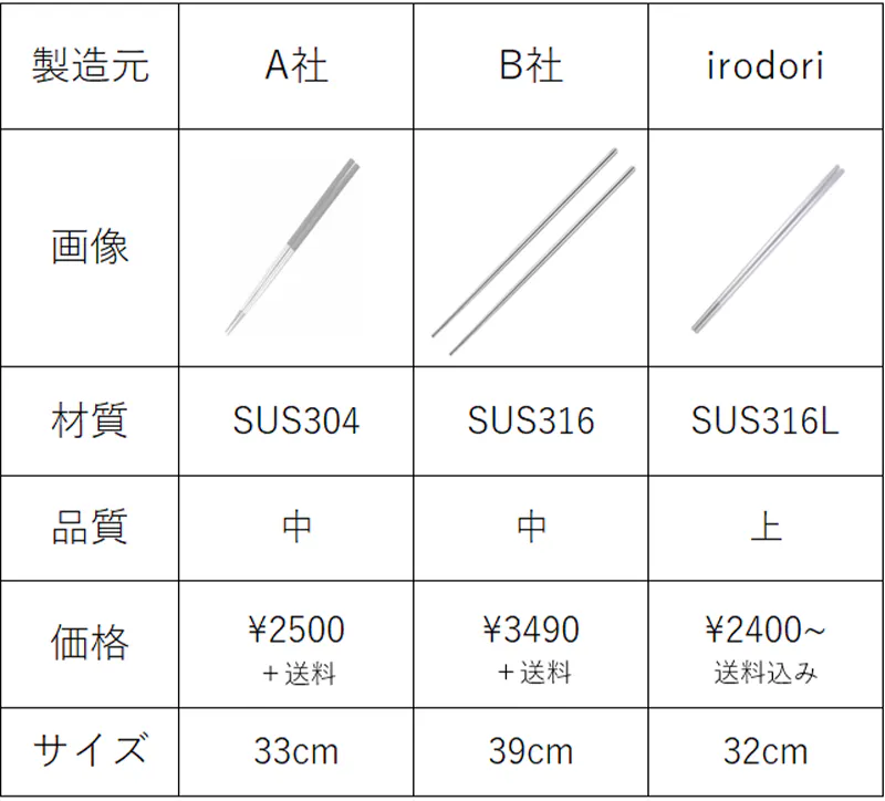 ステンレスの種類は200種類以上もありますが、「IRODORI」では心からの満足・安心・信頼感を求め、ステンレスの中でも特に高品質のSUS316Lステンレスにこだわりました。菜箸には贅沢過ぎる材質ですが安全に「やりすぎ」は無いという想いでセレクトしました。