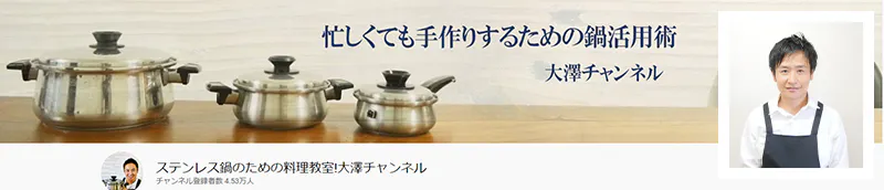 2016年からは「ステンレス鍋の料理教室!大澤チャンネル」(2022年4月現在:登録者4.6万人)というYouTubeを始め、お家のお鍋のポテンシャルを最大限に引き出すステンレス多層鍋ならではの調理法をご紹介しております。