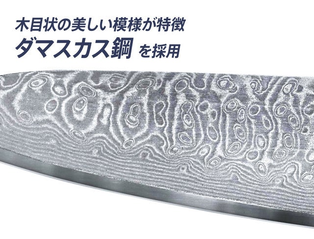 ダマスカス鋼の美しい紋様とV金10号の鋭利な刃が、あなたの料理の腕をさらに引き上げます。