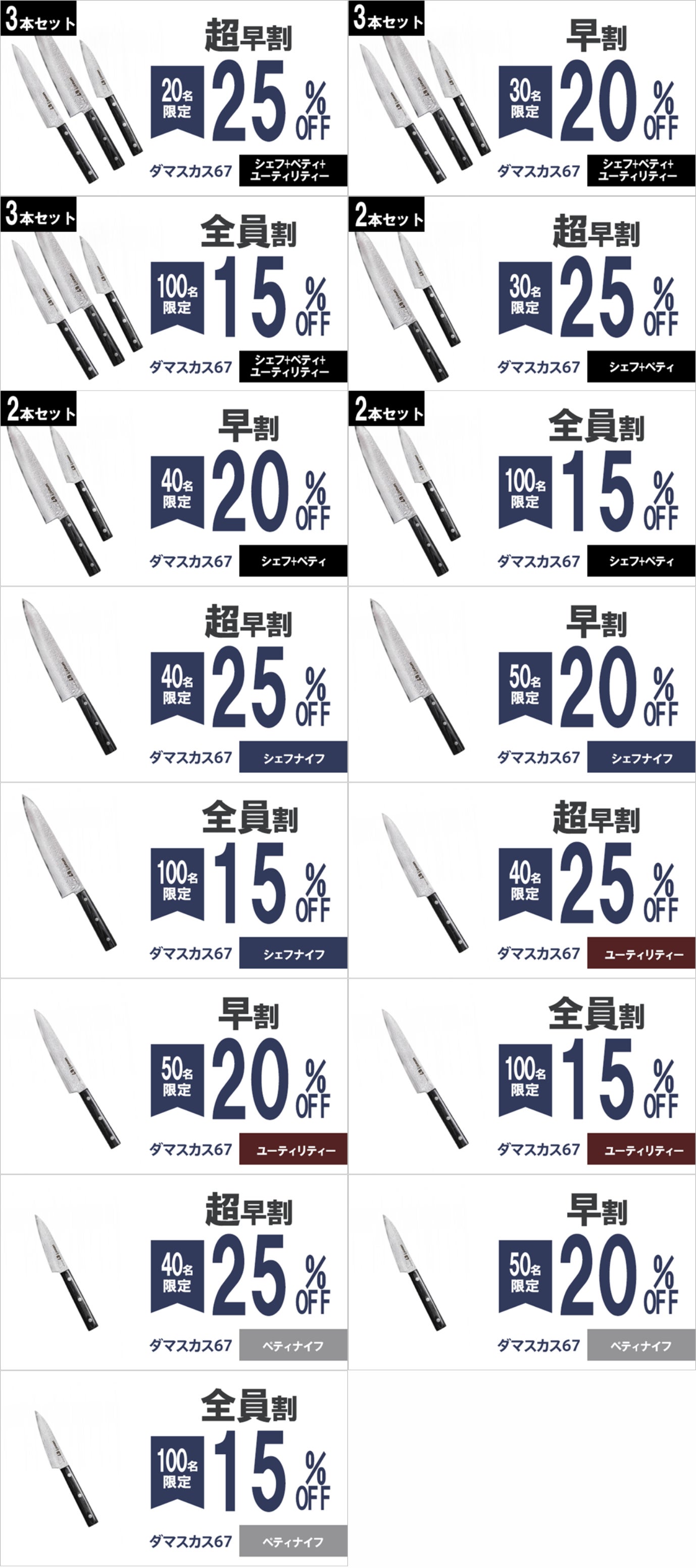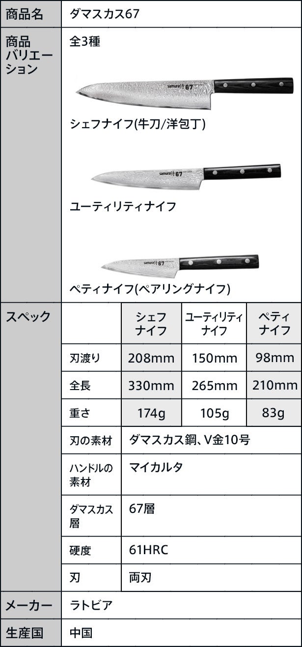 今回【ダマスカス67】は用途が幅広い「シェフナイフ」、柔らかい素材のカットに重宝する「ユーティリティナイフ」、ハンドリングがしやすく果物の皮むきに便利な「ペティナイフ」の3種類を用意しました。