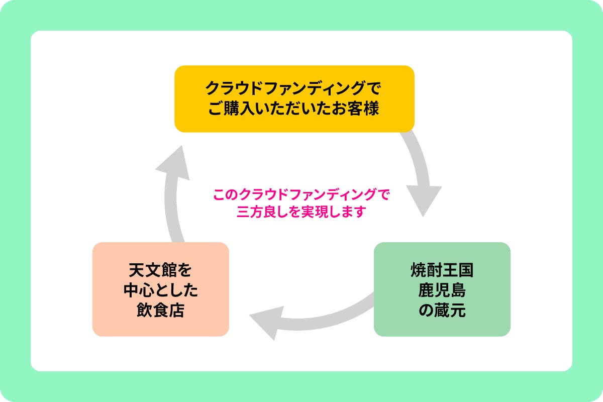 このなんとかしないといけない状況に一緒に立ち上がってくれたのが、鹿児島県酒造組合の皆さんでした。天文館と焼酎は切ってもきれない関係です。酒造組合の皆さんと「みんなで助けあいながら前に進んでいこう」と話し合い、今回のクラウドファンディングを立ち上げました。人生を豊かにするお酒の力を、天文館の元気を、鹿児島の焼酎を全国の皆さんのご自宅にお届けします!