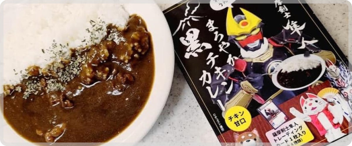 鹿児島のご当地キャラクター"薩摩剣士 隼人(ハヤト)"のオリジナルカレー、水出し緑茶、キャラクターグッズのセットです。