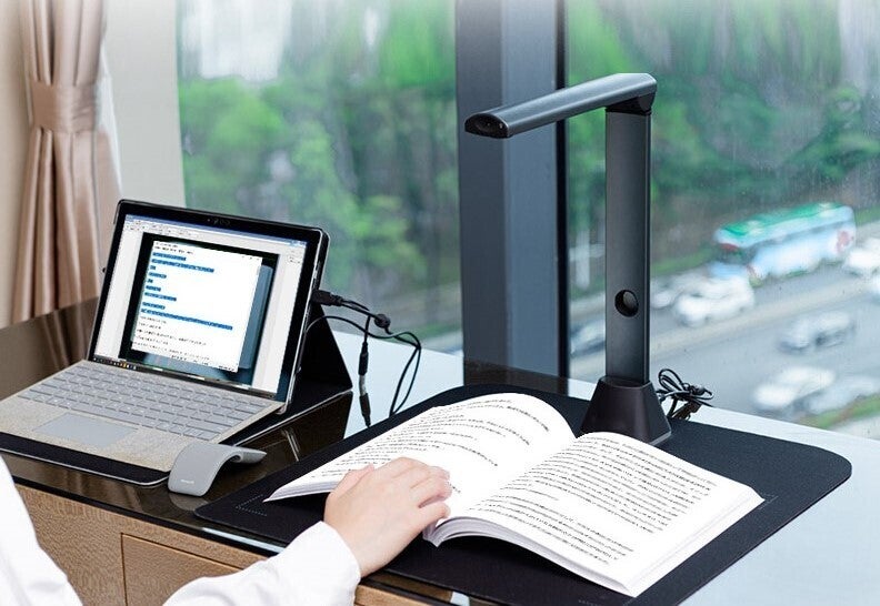 従来のフラットベッドスキャナーでは、本や雑誌などをスキャンする際、スキャナーを開いてきれいにセットし、蓋を閉じて印刷。面倒なうえにきれいにスキャンできない場合もあります。
