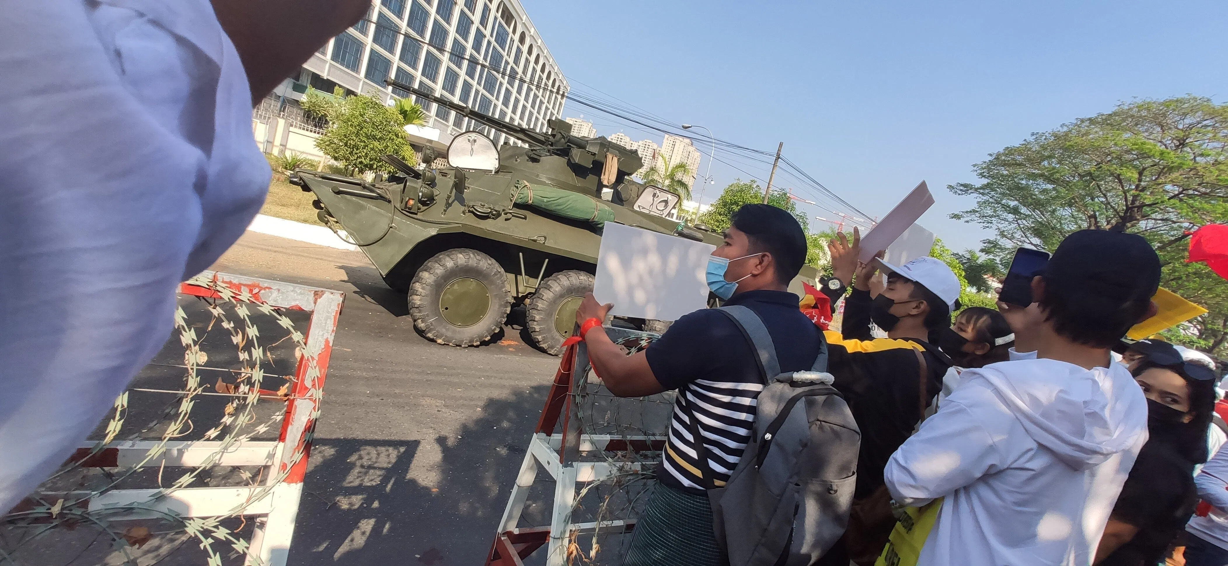 中央銀行前を警備する国軍の戦車への抗議