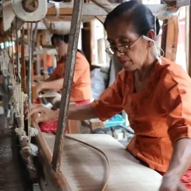 インレー湖畔の小さな工房では、地元の人たちが蓮の栽培から布織まで