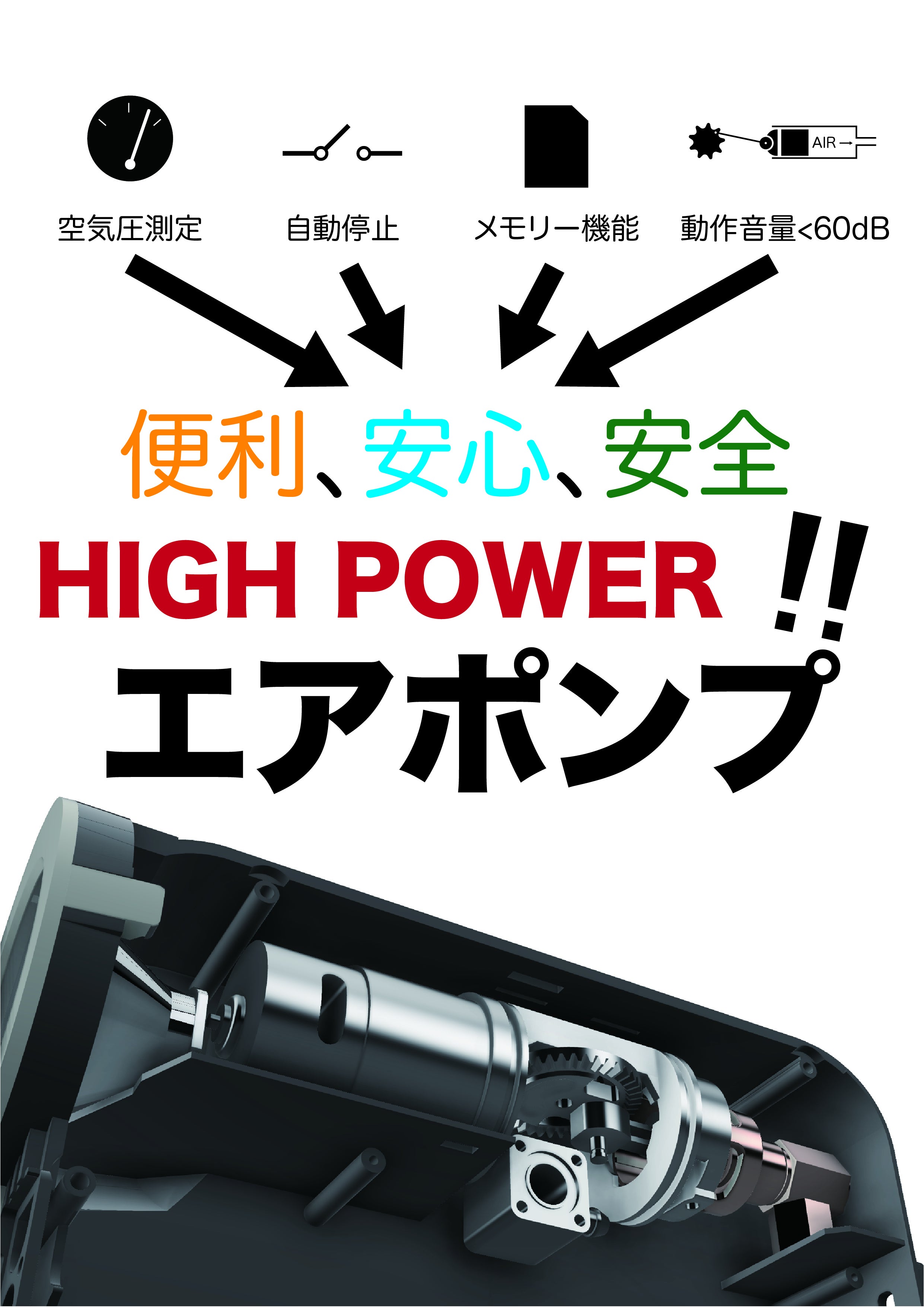 空気圧測定、自動停止、メモリ機能付きで、操作も楽々。自動車タイヤなら3本、バイク(自転車)タイヤなら16本、バスケットボールなら80個を満タンにできます。<5種類のノズル付き>