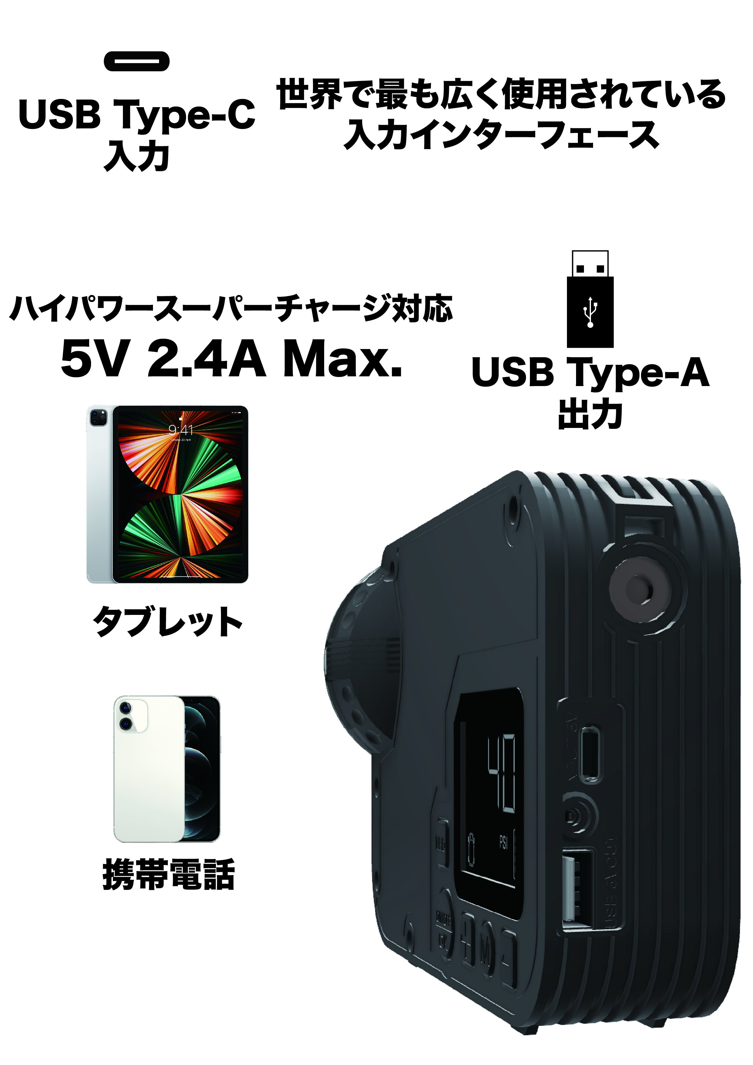スマートフォンなら2回、タブレットなら1回のフル充電が可能です。<【USB】Type-C>