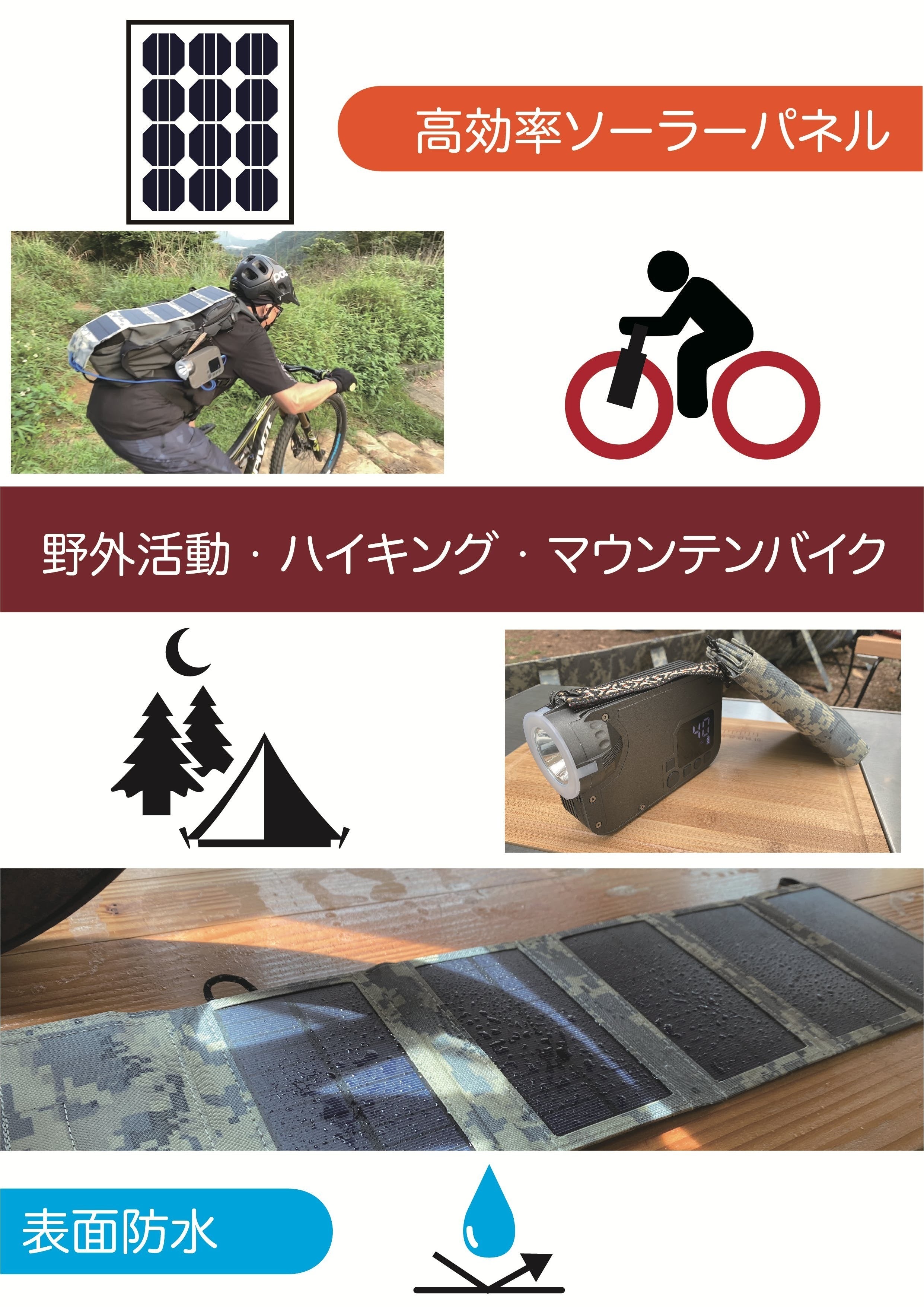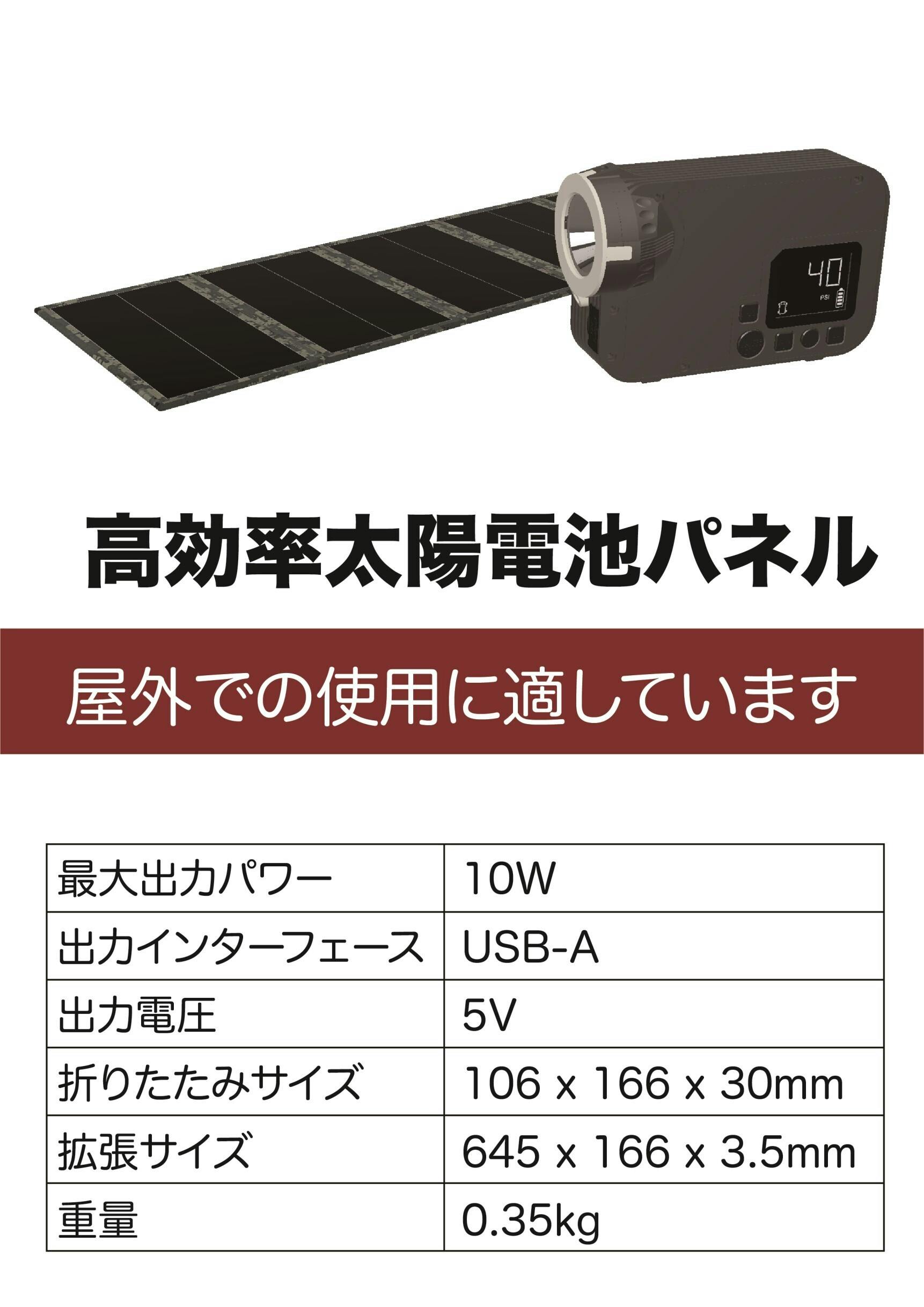 付属の太陽光ソーラーパネルを使えば、電源のないアウトドアや災害時にも活躍します。