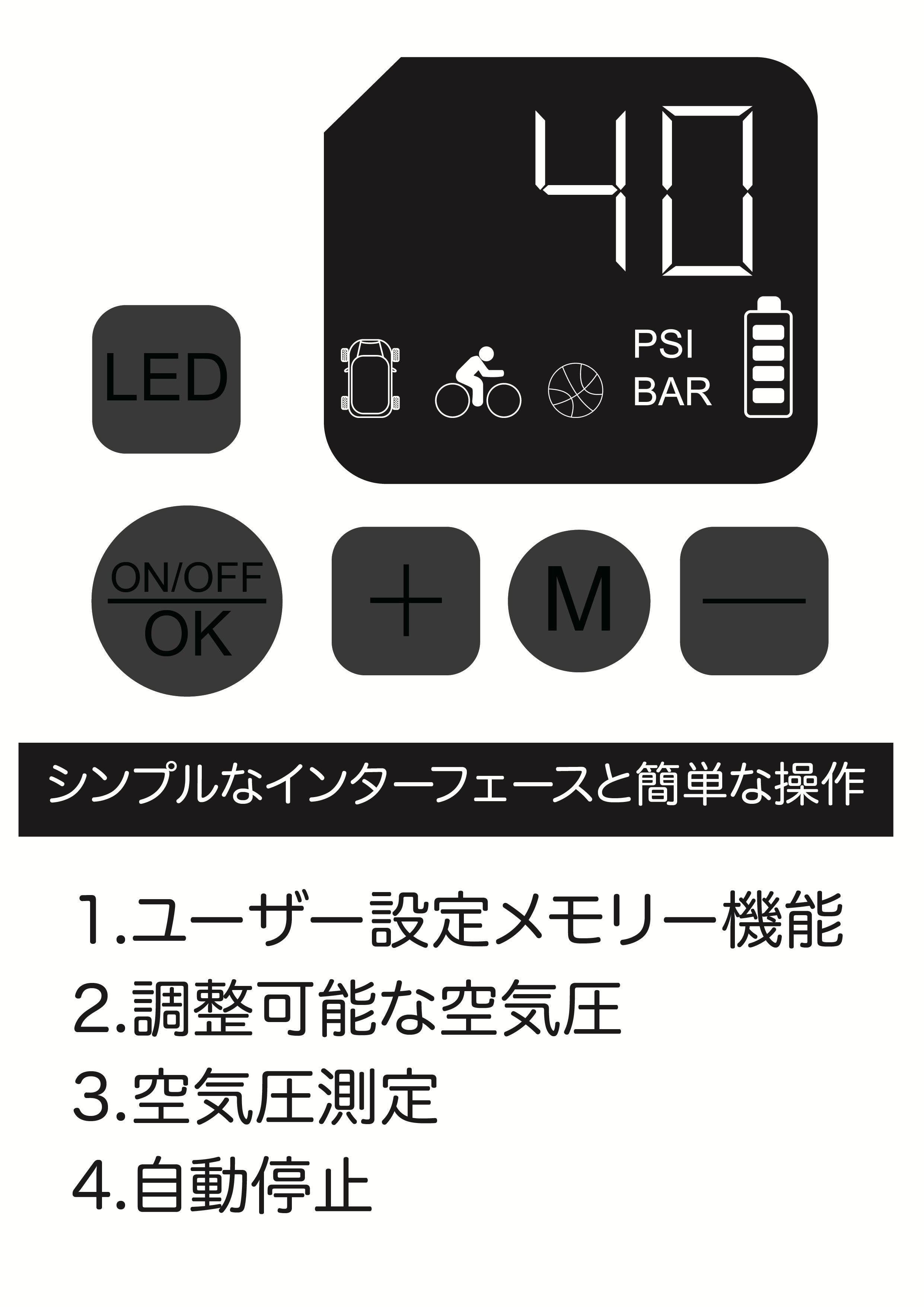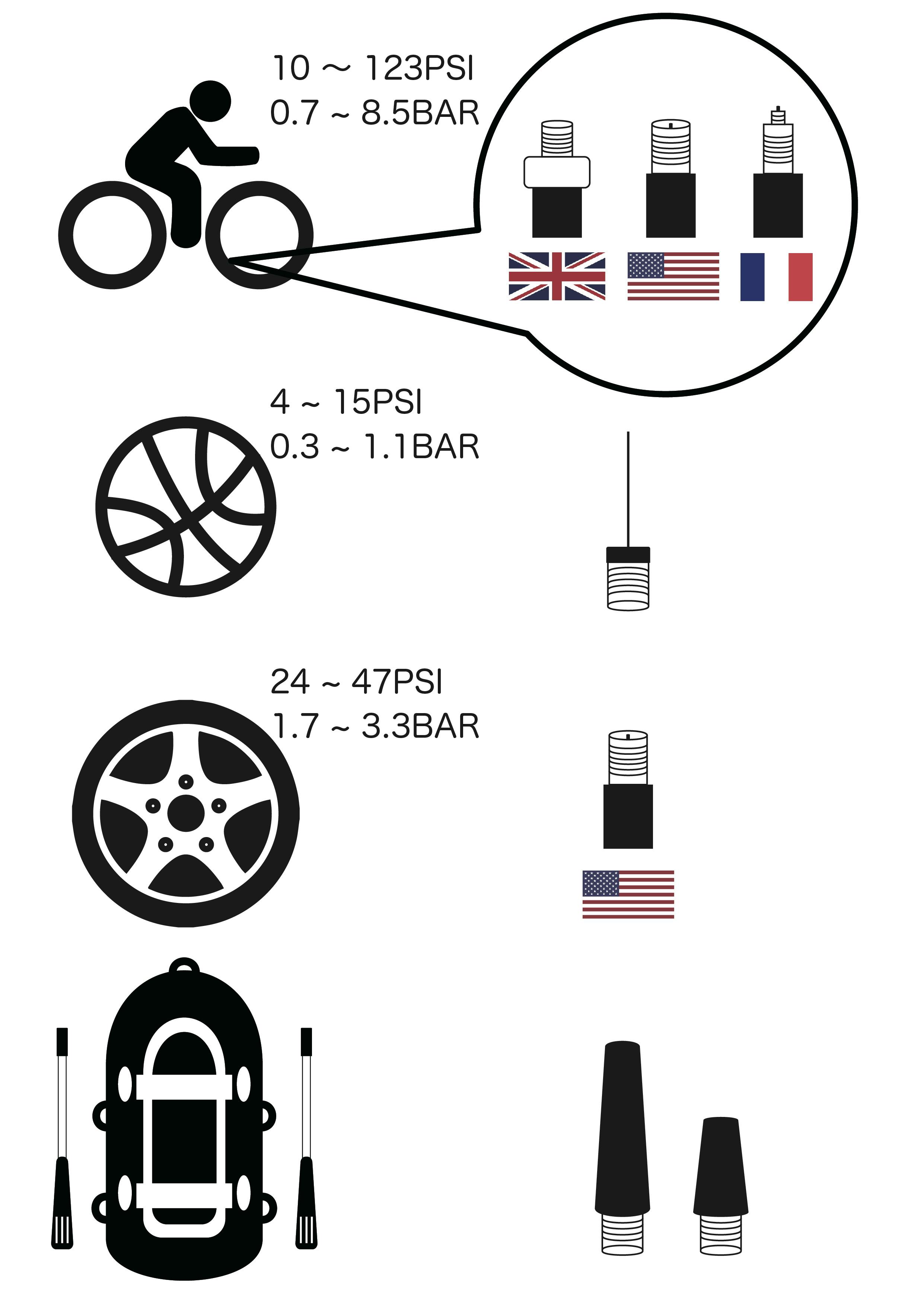 ・自転車タイヤ範囲:10~123PSI、0.7~8.5BAR