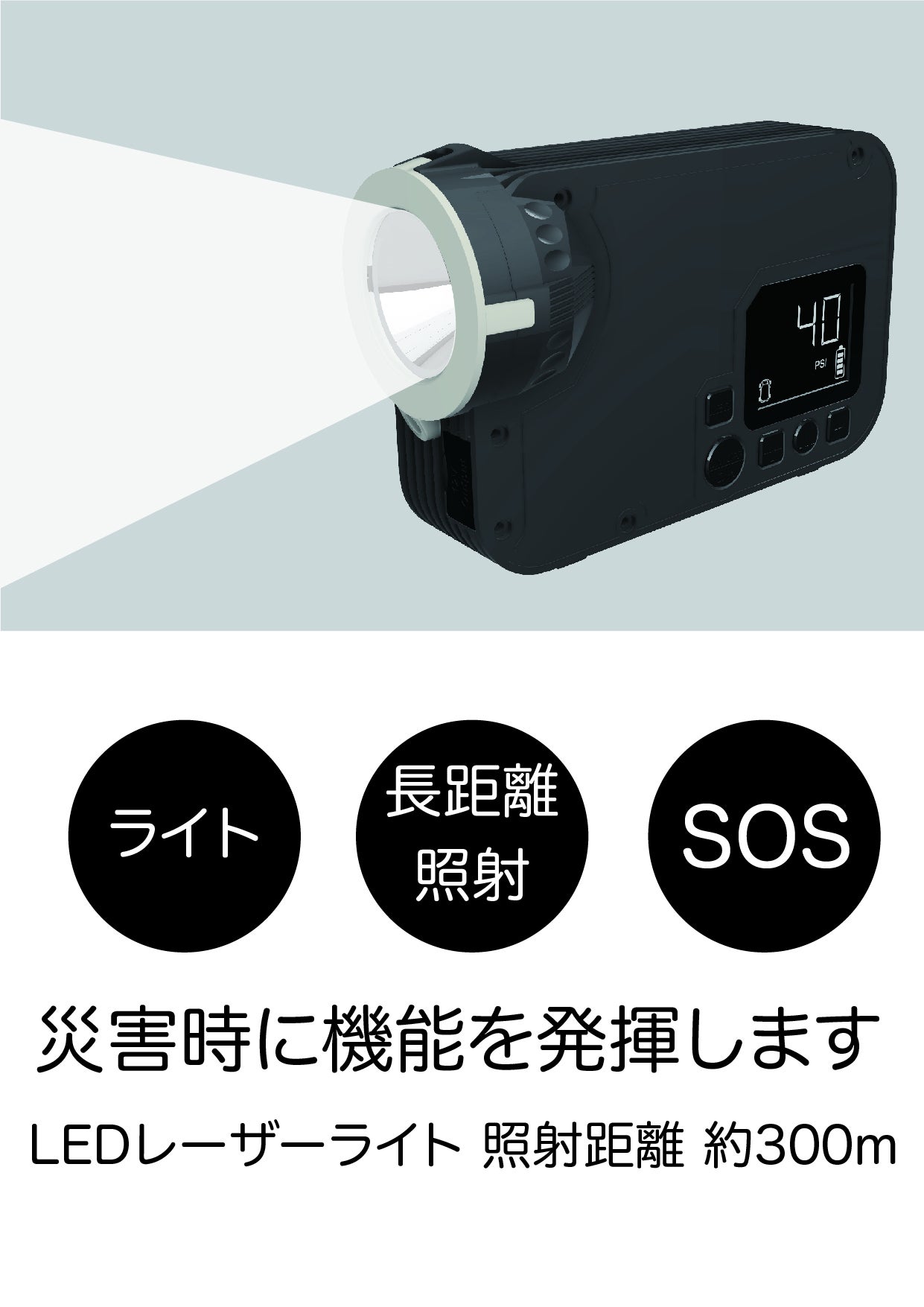懐中電灯モードでは約300m先まで照射可能。災害時に使えるSOS機能(点滅)付きで、万が一の際にも安心です。なおライトモードでは180度の広範囲を照らすことができます。