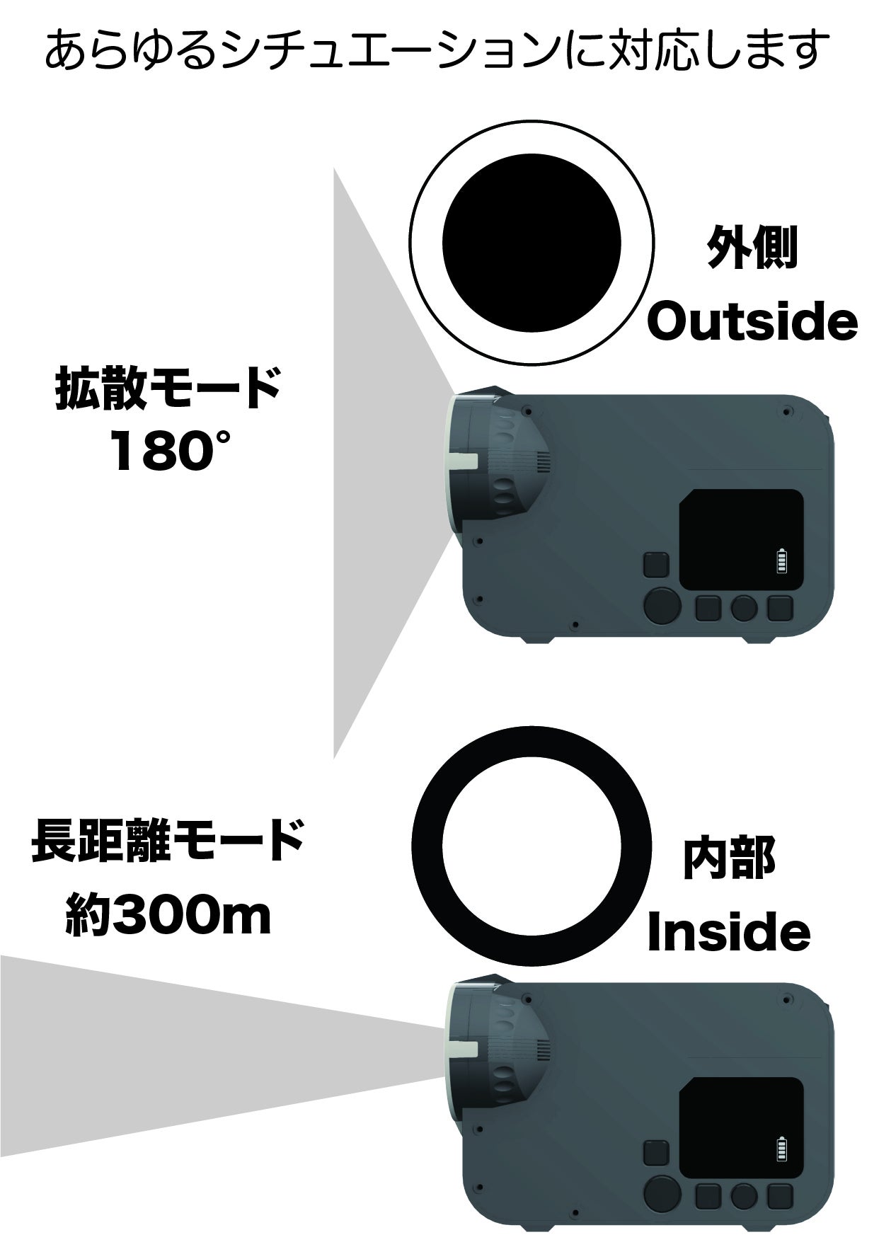 使用シーンに合わせて懐中電灯/ライトの切替が可能です。