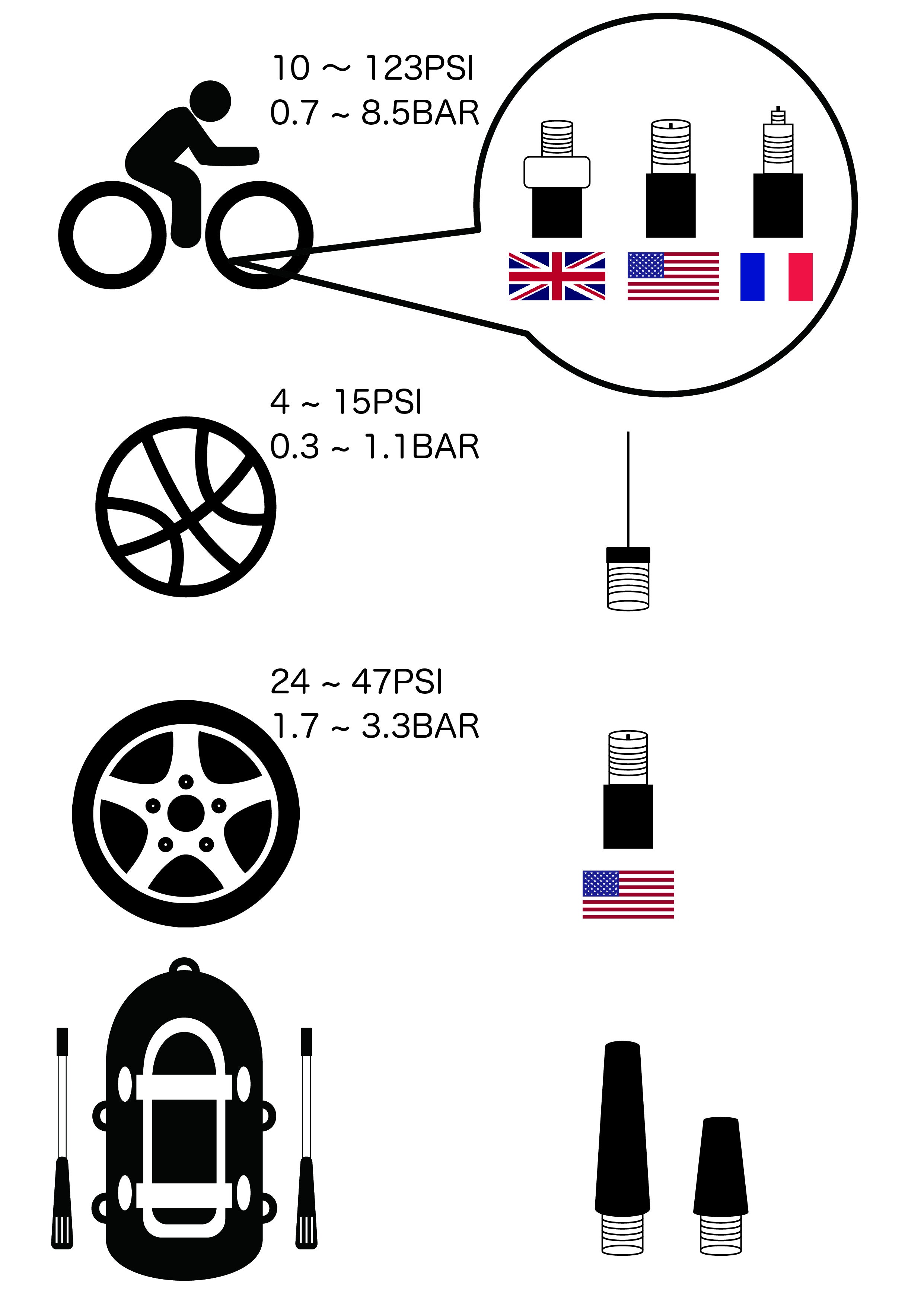 ・自動車タイヤ範囲:24~47PSI、1.7~3.3BAR