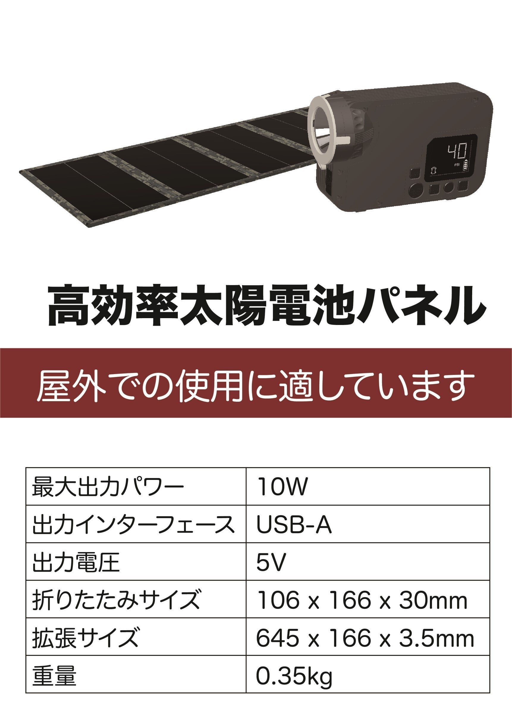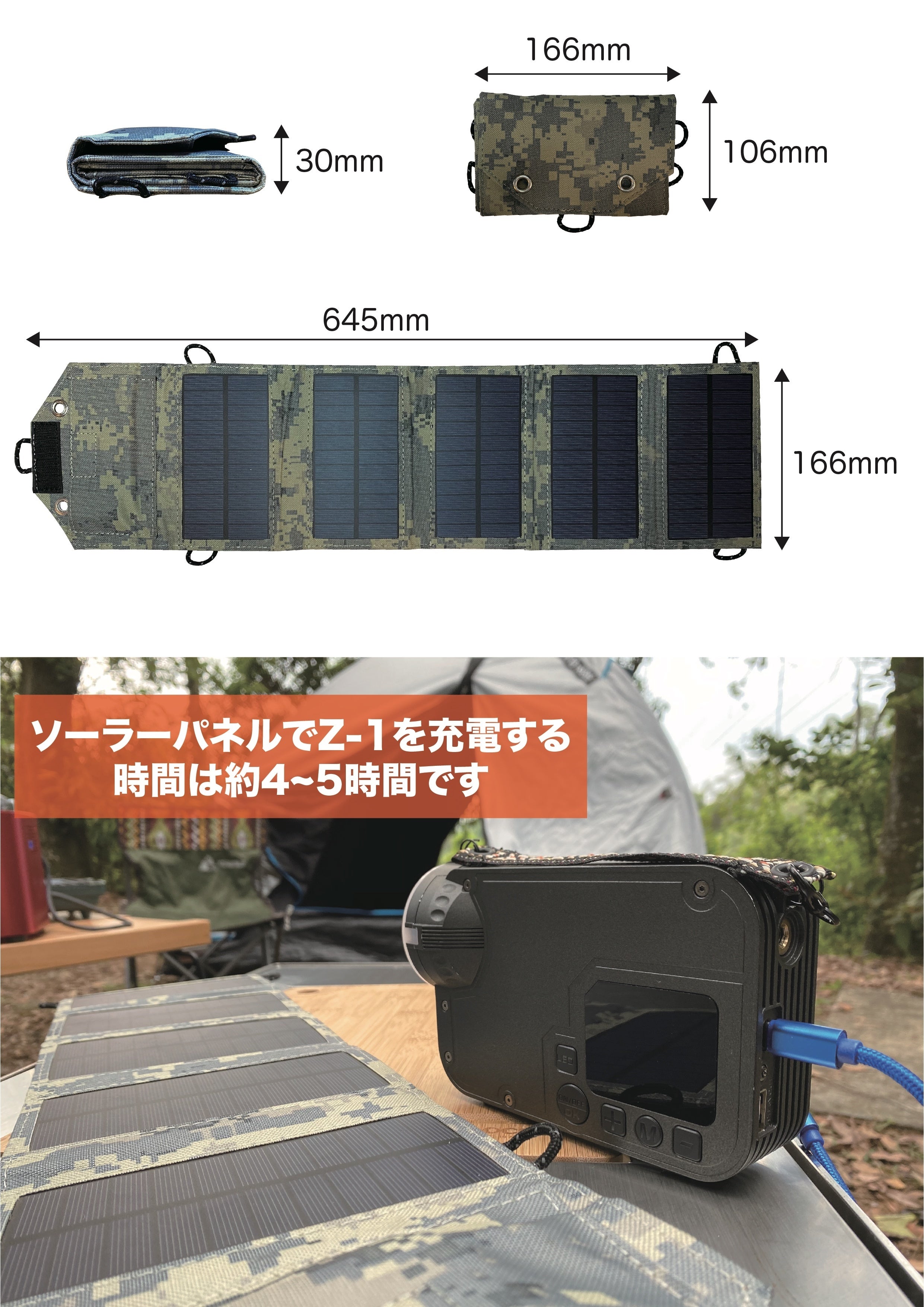 特殊素材を使用し、表面には防水加工を施しました。耐久性、耐水性にすぐれ、雨天時などの水濡れにも安心です。広げても64.5cm×16.6cmのサイズで、場所を取りません。折りたたむとZ-1本体ほどのコンパクトサイズ (16.6cm×10.6cm×厚み3cm)に。約4時間の充電で、機能を発揮できます。重量350g、最大出力10W、電圧5Vです。