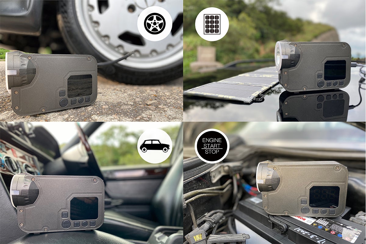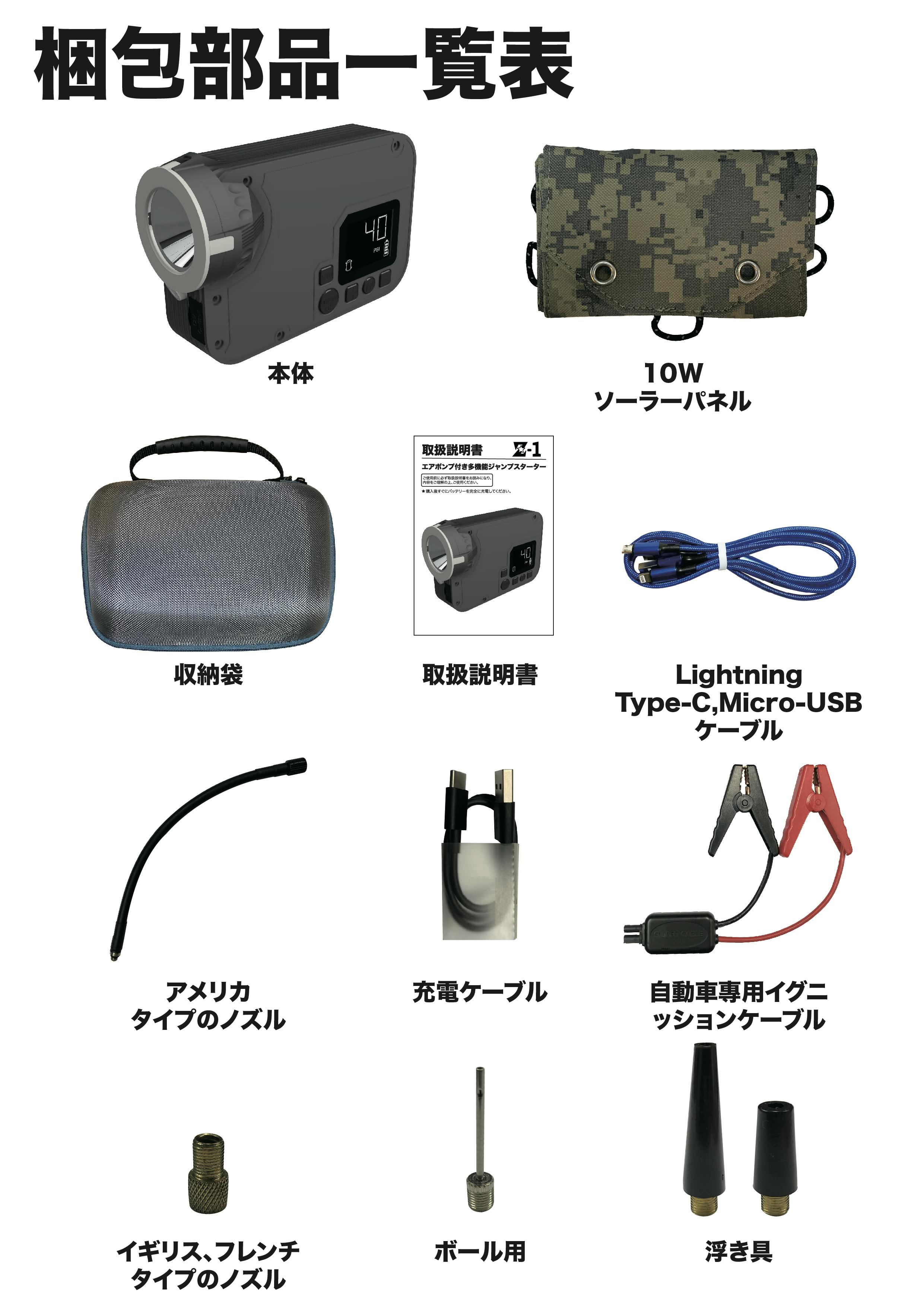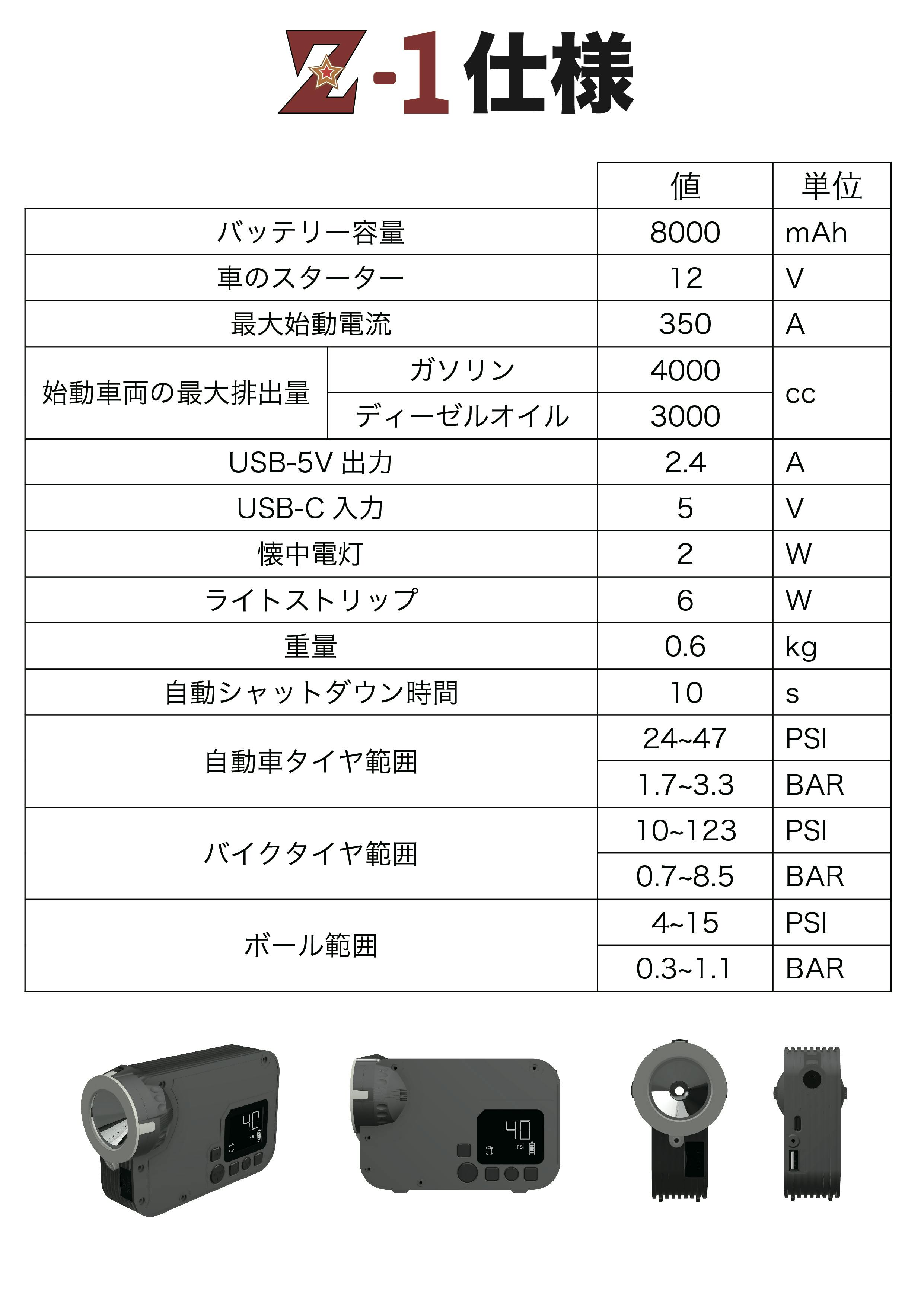 ガソリン車最大4000cc、ディーゼル車最大3000ccをフル充電。安全性の高いリチウムイオン電池を使用しています。蓄電量8,000mAh、-20℃から60℃の環境で使用可能です。