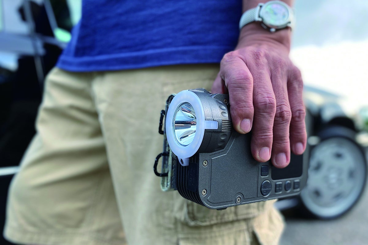 ライト(6W)は左右180度の広範囲を照射でき、アウトドアや夜間の活動に便利です。