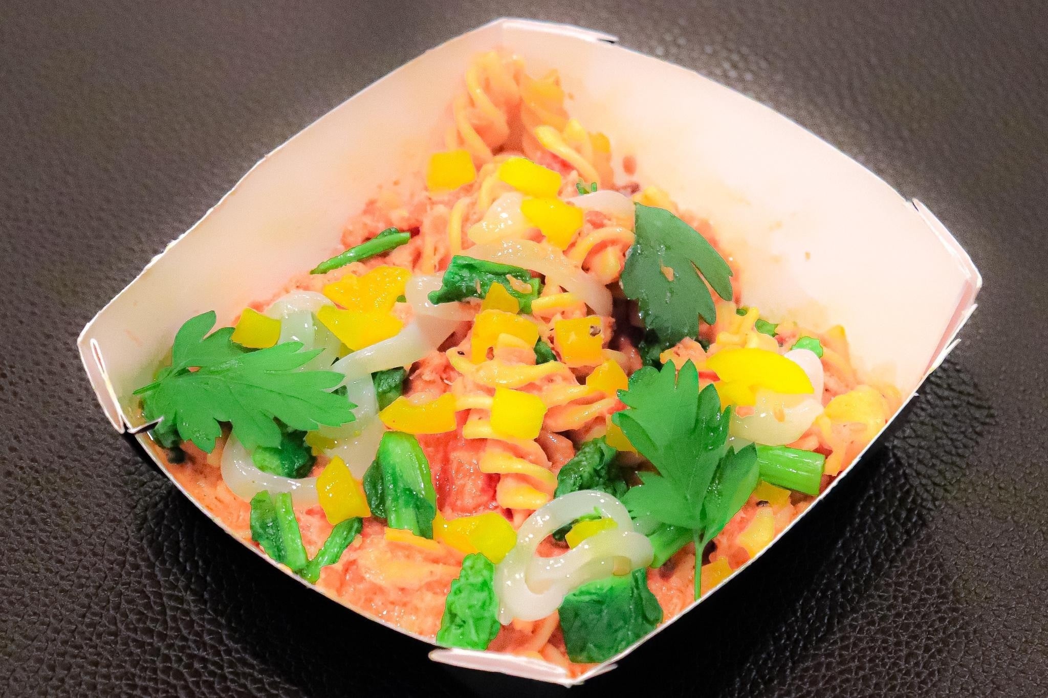 通常の冷凍パスタは、ソースとパスタが別々に冷凍され、食べるときに自分で絡めて食べるスタイルですが、今回開発したパスタは、あらかじめソースとパスタが絡んだ状態で冷凍させるため、すでに、美味しさが99%まで完成されているのが特徴。