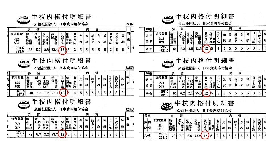 特選松阪牛は約50ヶ月の超長期肥育(通常は24〜30ヶ月前後)によりBMS12番を連続で獲得した実績があり、信じられない確率である為「奇跡」の松阪牛とも呼ばれます。