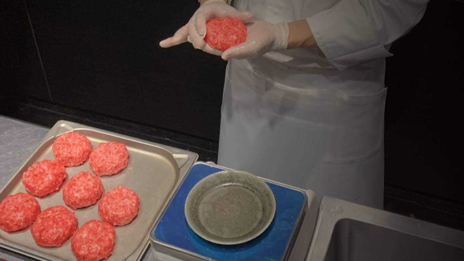 素材にこだわり、レシピも極力繋ぎを使わないようこだわり、次はハンバーグをg数ごとに分けて焼き上がりの大きさの検証に入りました。カレーソースとの比率も考慮し、可能な限り満足感のある大きさに。