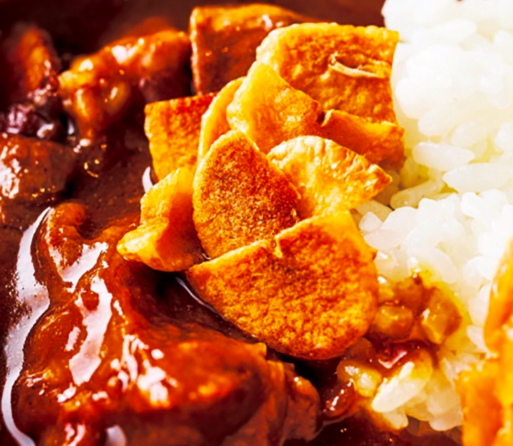 特選松阪牛カレーは、超長期肥育により繊細に脂が赤身に溶け込み霜降りとなり、その熟成された肉の甘みが、カレーソースに絶妙に絡むことで他には真似できない濃厚なコク、旨味を生み出しています。