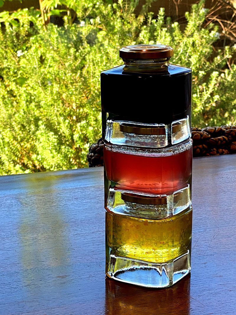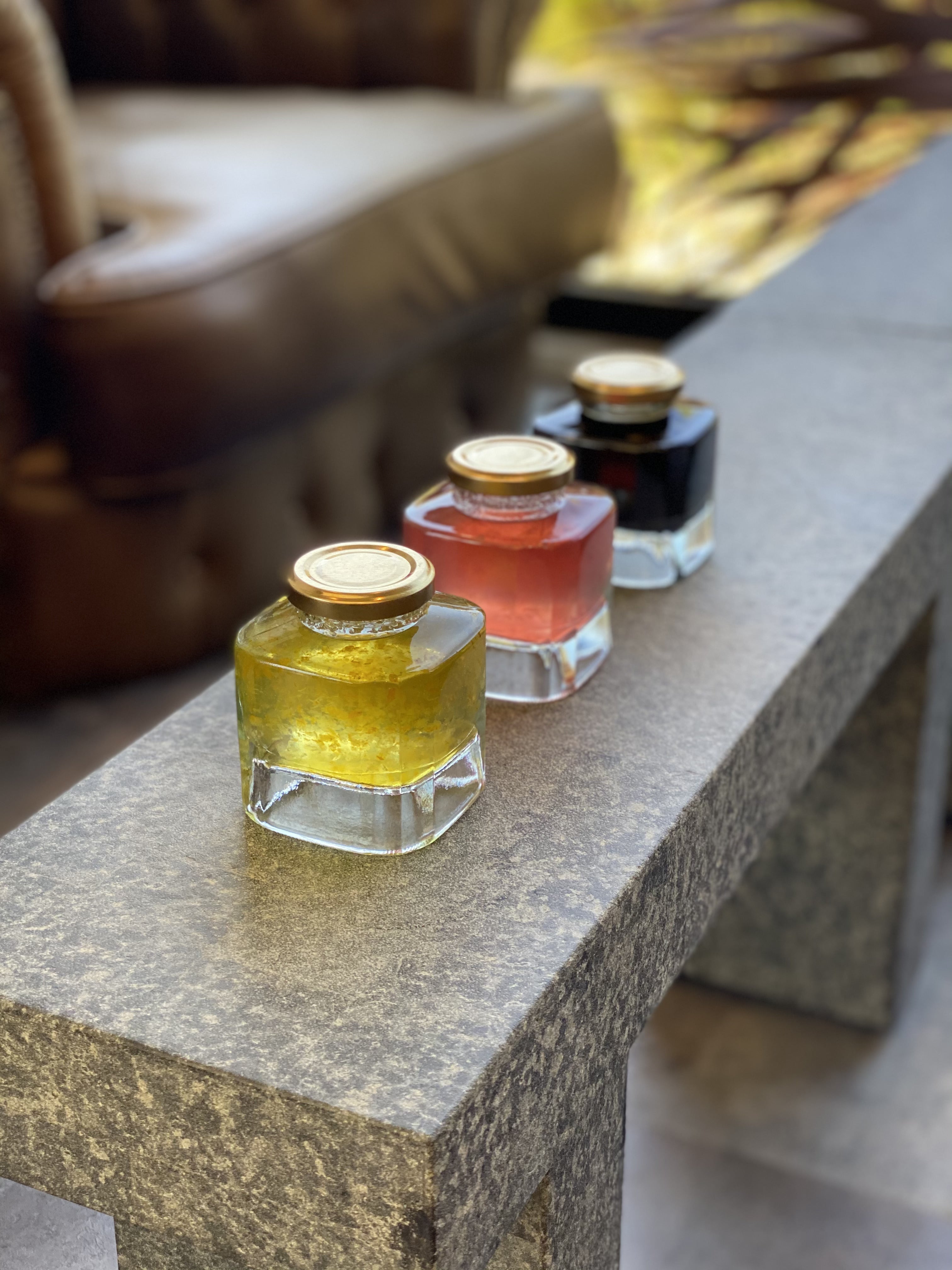 容器や箱にもこだわりました。容器は光を浴びることで中身と共に宝石の様に煌めくボトルを採用。積み木の様にスタッキングしたり、並べたり、常温保存可能なのでディスプレイして置いてある空間をお洒落に演出します。アフターユースも幅広くできて蜂郎を通して何度も満足して頂けると思います。