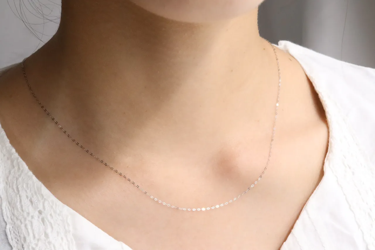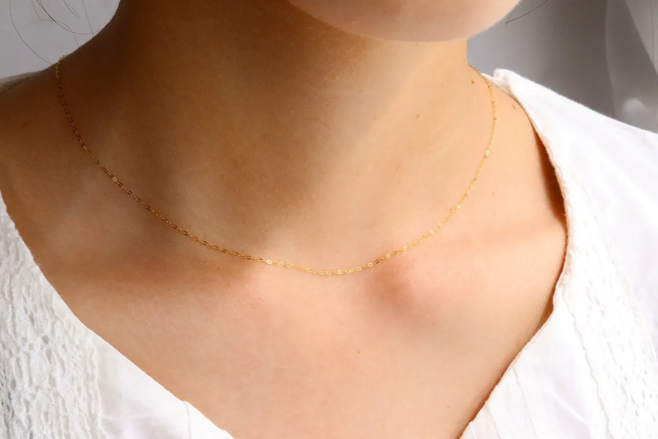 女性の首元を飾る18金のネックレス。その上質な輝きは、品のある大人の女性を演出してくれます。